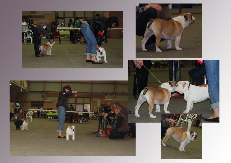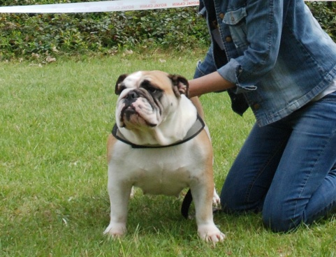 Sujet bien proportionné. Format superieur au standard. Crâne fort, large et carré. Bon layback. Narines bien ouvertes. Yeux bien foncés. Yeux bien placés. Sclerotique apparente lorsque le chien regarde devant lui. Oreilles en rose. Machoire large et bien recourbée. Bonne courbure de la mandibule. Bonne ossature, bons aplombs avant. Côtes bien rondes. Bonne ligne de dessus. Bon arrière main. Bonnes angulations arrière. Bons pieds. Queue droite et bien placée. Démarche lourde et contrainte typique. Excellente présentation.