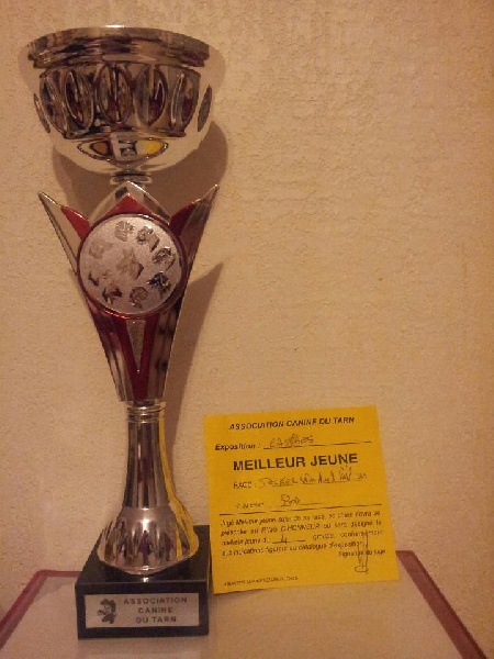 Excellente tête avec yeux bien foncés et orailles bien plantées.Noir et feu.Excellente qualité de poil.Excellente poitrine.La ligne du dessus est très légèrement plus haute que le garrot dû à une angulation un peu trop raide.Aplombs arrières bien parallèles.Excellent en mouvement.