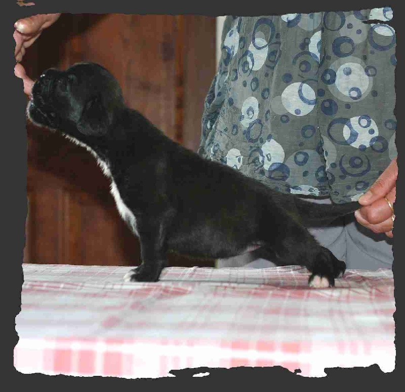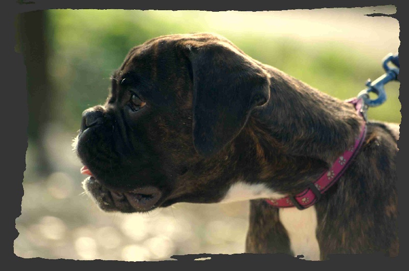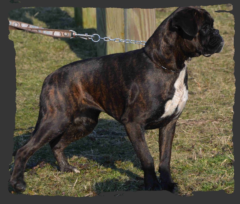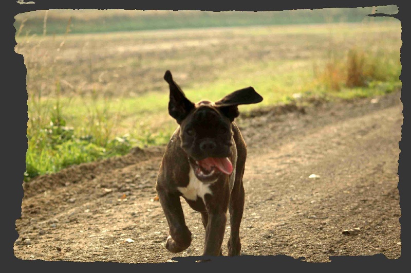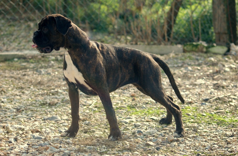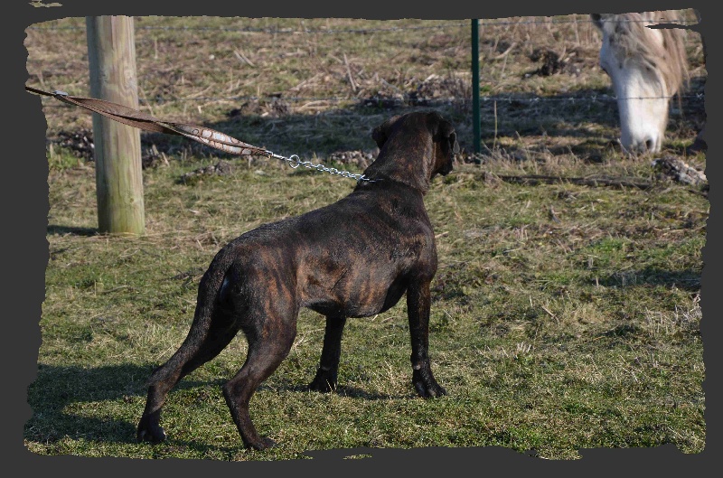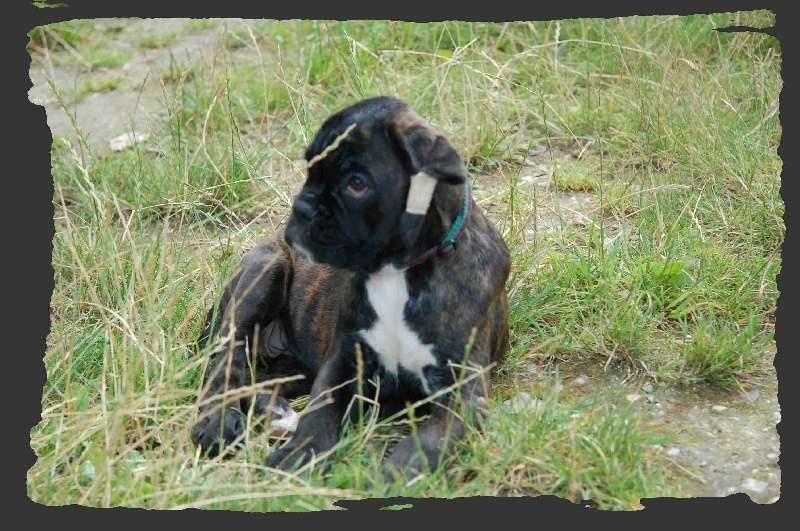 3 mois.Belle couleur bringée légèrement marquée en blanc. Carrée, élégante et féminine. Bonne ossature, bonne substance, bonne sortie d'encolure.Droit droit et ferme. Excellentes angulations AV/AR.Poitrine bien descendue, bon poitrail.Jolie tête typée avec de très bonnes proportions.Stop et menton bien marqués. Babines biens dessinées. Yeux foncés. Bonne dentition en mutation : ligne des incisives un peu arrondie.Allures juvéniles mais très satisfaisantes.