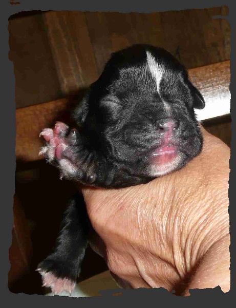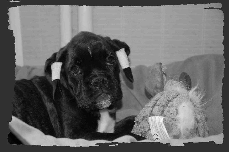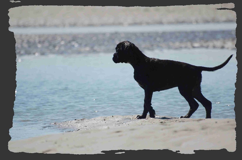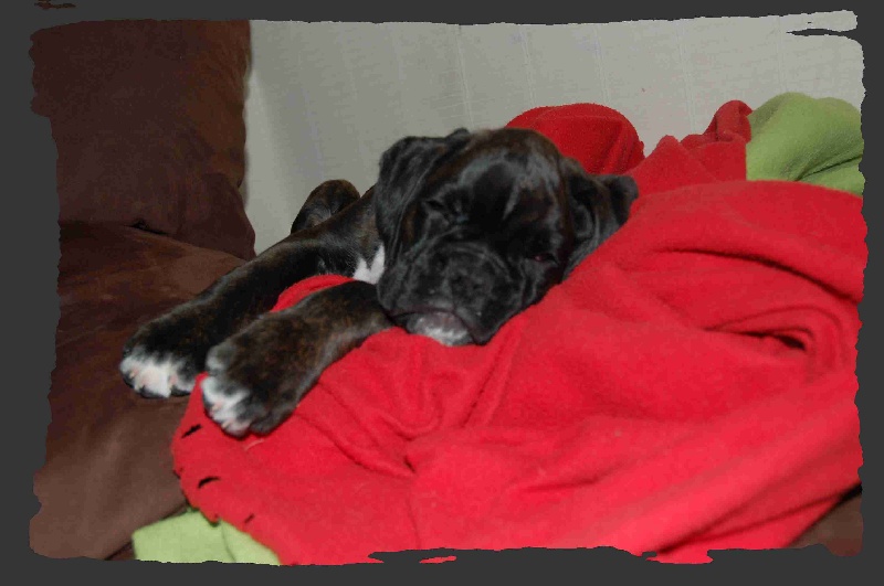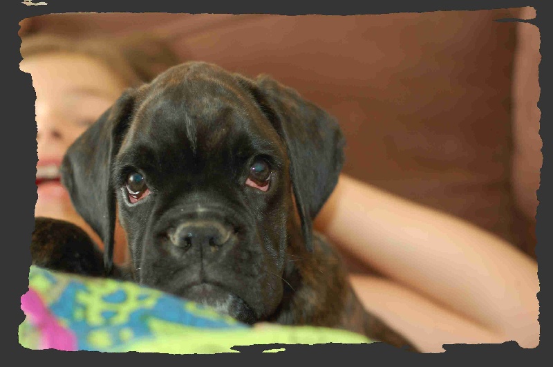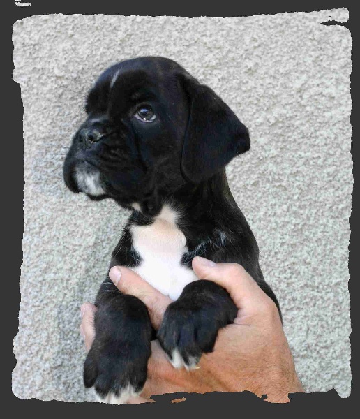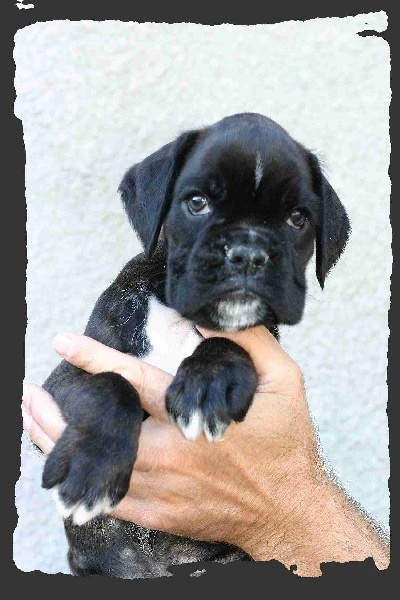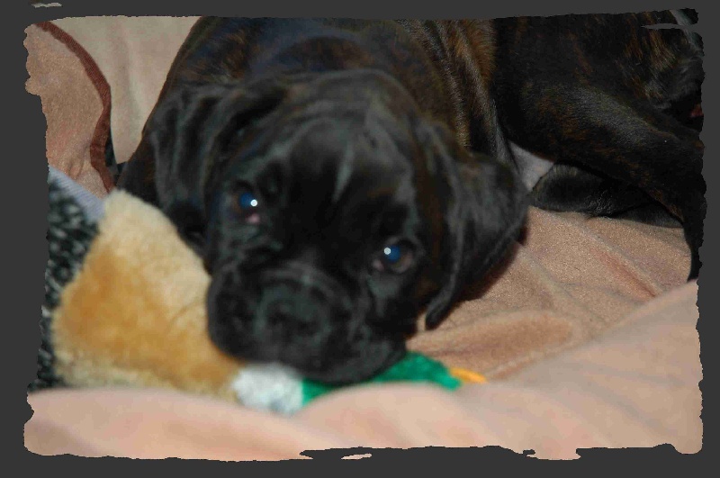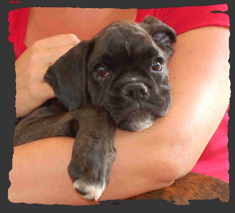 3 mois.Belle couleur bringée légèrement marquée en blanc. Carrée, élégante et féminine. Bonne ossature, bonne substance, bonne sortie d'encolure.Droit droit et ferme. Excellentes angulations AV/AR.Poitrine bien descendue, bon poitrail.Jolie tête typée avec de très bonnes proportions.Stop et menton bien marqués. Babines biens dessinées. Yeux foncés. Bonne dentition en mutation : ligne des incisives un peu arrondie.Allures juvéniles mais très satisfaisantes.