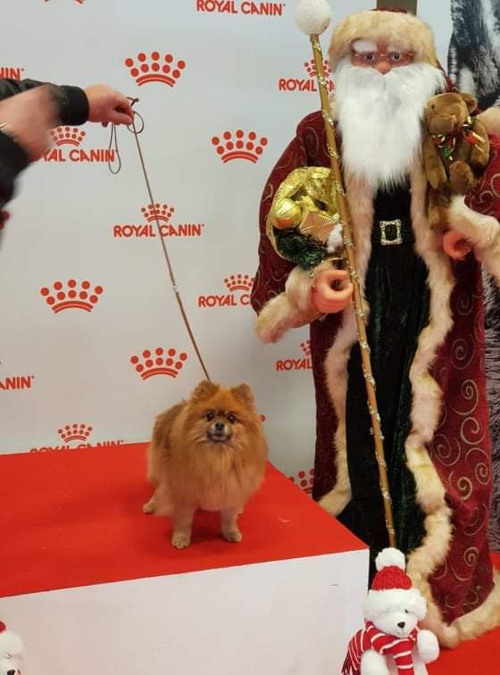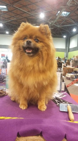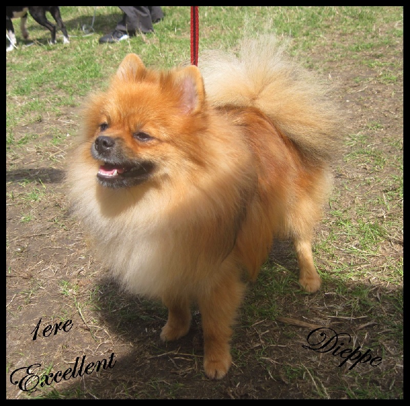 Dentition correcte, type pom, bonne sortie d'encolure, bonne construction, bonne proportion avec une bonne ossature, bons aplombs et angulations, bonne fourrure, mouvement correct