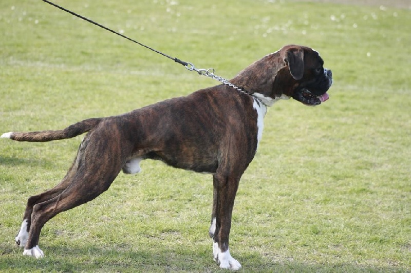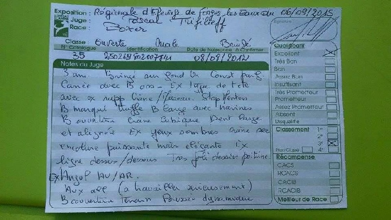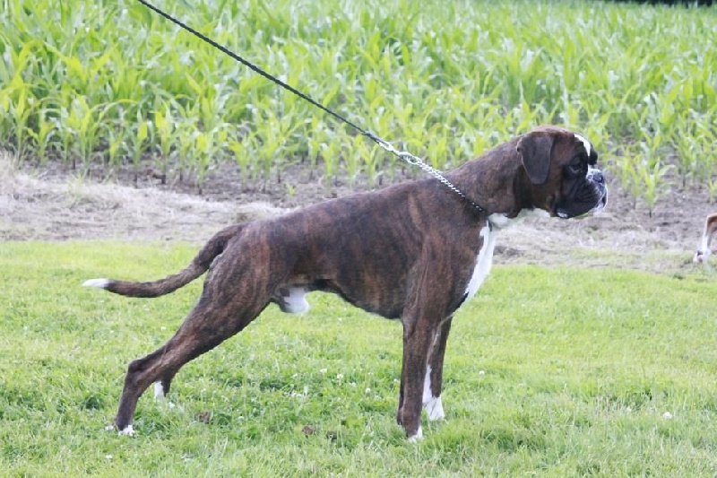 19 mois, bringé/cuivre marqué en blanc , Excellent type de tête, excellent rapport crâne/museau, Truffe large, régulière,Excellente denture saine, large avec excellent prognatisme,Excellent yeux par la forme et la couleur,Encolure noble bien sortie,a très léger fagnon,Construction montante avant épaule un peu droite,Les cuisse pourraient être un peu larges,La région lombaire manque un peu de fermeté,Allure libre avec une bonne poussée.