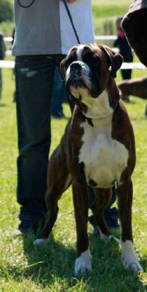 exc prognatisme avec mâchoires larges, chien qui a beaucoup de classe, TB tête avec substance encore juvénile, carré, montant, TB angulé, poitrine au coudes, TBpied, le rein manque encore un peu de substance, B croupe et fouet, TB encolure et noble, TB tête, crâne bien ciselé, front haut, museau bien cubique, chanfrein B longeur, Babines bien dessinées, Menton bien marqué, Ex allures amples avec un dos correct en action.