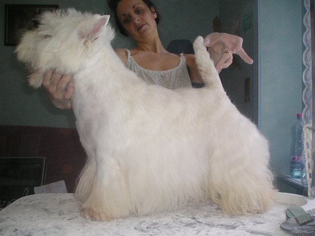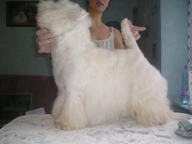 excellentes proportions, superbe tête, excellente expression, remarquable encolure et ligne de dos, excellents aplombs, très bonne arrière main, excellente texture de poils, toilettage remarquable, excellente présentation d'ensemble.