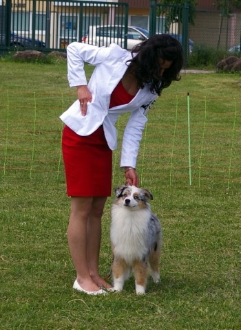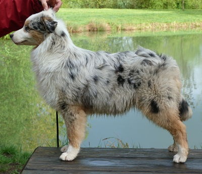 Jolie poupée agréable à examiner. une belle couleur merle et bien pigmentée, ensemble de tête bien typé malgré des oreilles un peu sur le coté, silhouette remarquable, os bien présent, les allures confirment bien la morphologie, aller retour et profil
