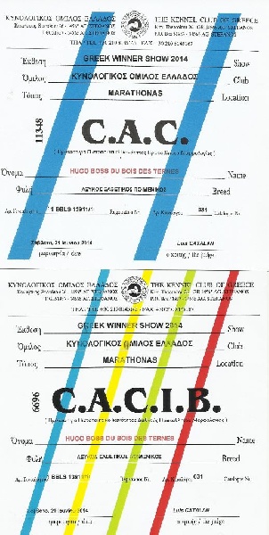 GREEK WINNER 2014 (titre honorifique)CIM - 19 mois: bon type, tête proportionné, dentition correcte, oreilles correctes, avant régulier, bonne angulation, bonne poitrine, bon corps, bonne ligne de dos, bonnes conditions de manteau, se déplace bien, bon tempérament.