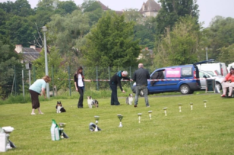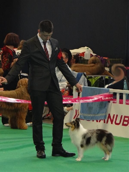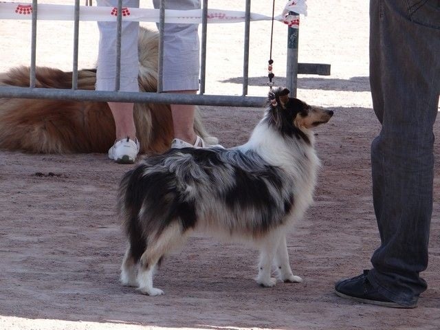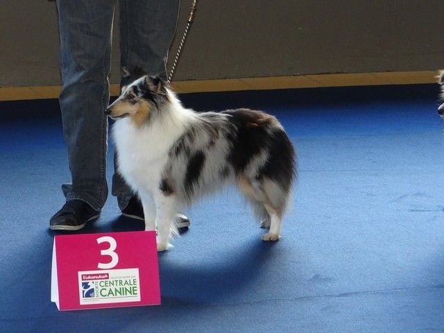 Chien typée, exc oeil, crâne et oreilles. Le stop est un peu effacé, très bonne encolure, exc dessus, très bon fouet, ossature correcte.Exc aplombs devant, légèrement panard de derrère, exc fouet, A/R correct.Exc mouvement de profil, bonne prise de terrain.Exc fourrure.La robe bleu-merle présente de nombreuses tâche.