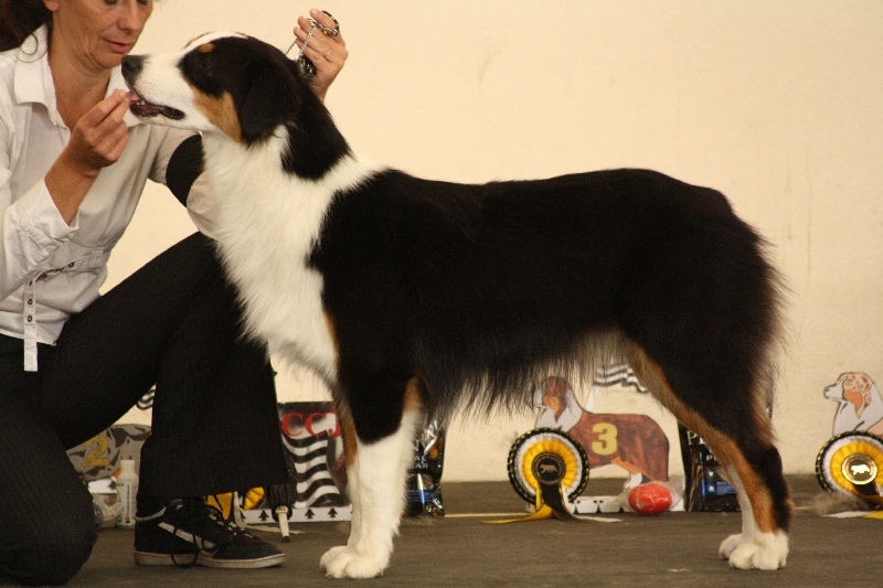 10 mois - Tricolor - tête longue - le crane devra s'elargir et le stop devenir plus franc et le parallélisme aussile chien fait très adolescent d'aspect - Exc ligne de dessus - exc ossature - l'arriere main a encoe besoin d'évoluer - beaucoup d'amplitude aux allures, cela dit l'arriere main est poussé plus vite.chien qui a besoin de se finir