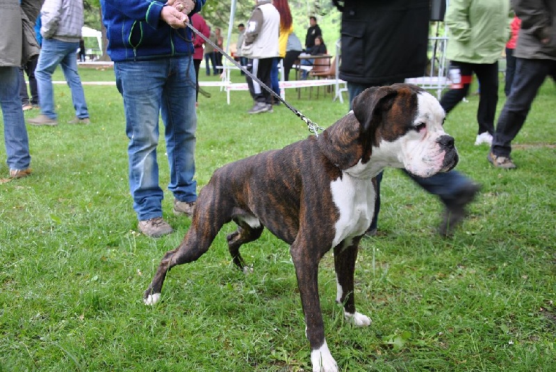 15 mois. Bonne taille, élégant, bringé foncé, très marqué en blanc. Bonne structure de tête, TB stop. Yeux foncés, Paupières dépigmentées, TB prognatisme, Denture large et alignée, incisives très fortes, très bon cou, ligne supérieure serait souhaitée plus droite, Exc ligne inférieure, bonne profondeur et largeur de poitrine, coudes un peu libres, TB ang. AV/AR, bonnes allures.Le chien semble inquiet sur le ring.