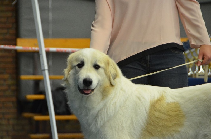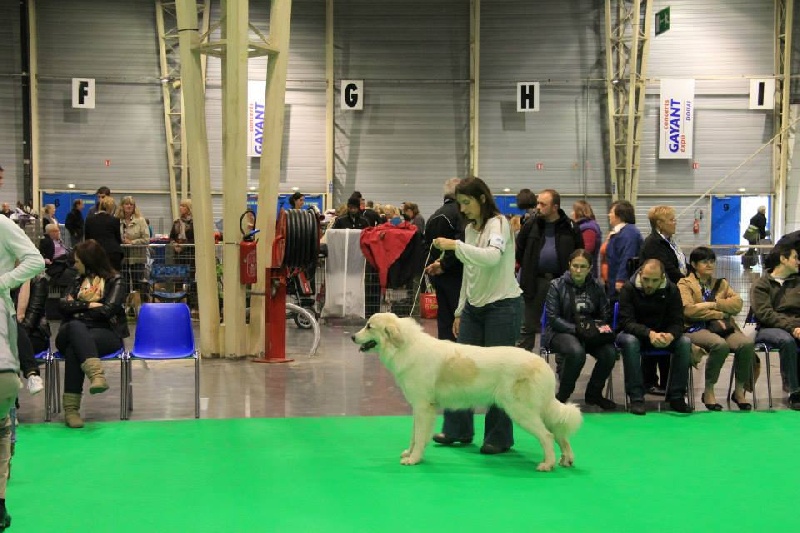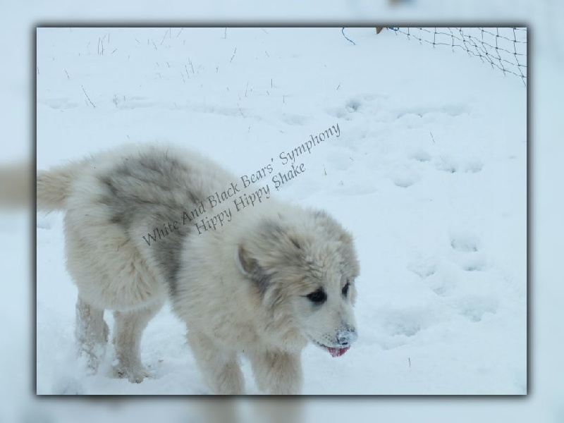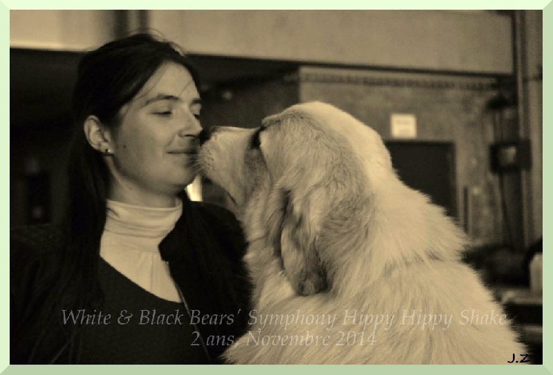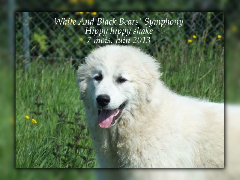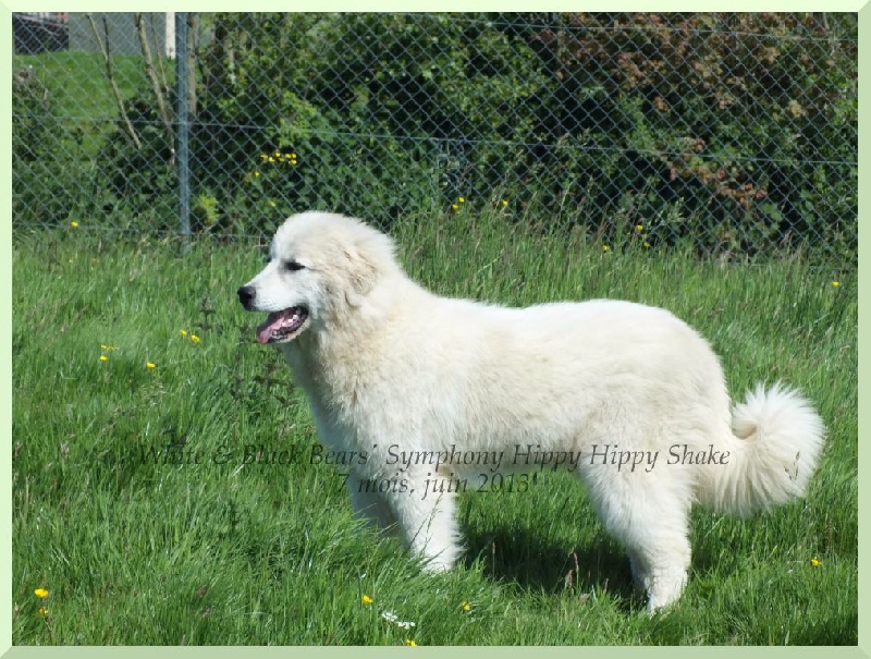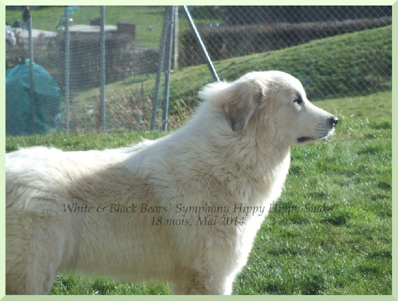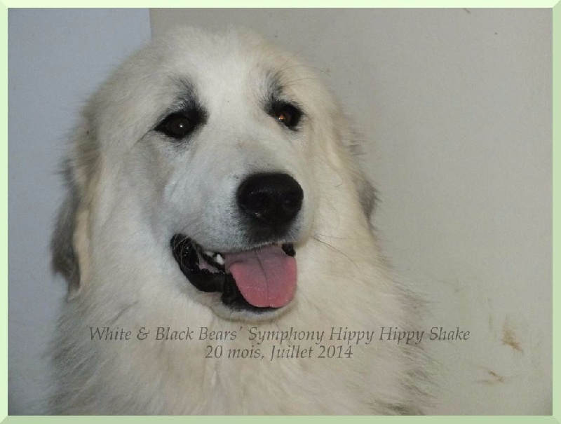 montagne des pyrénées, chiotNom: White and Black Bears' Symphony Hippy hippy ShakeDate de Naissance: 05/11/2012Identification: 250 26 96 04629232LOF: 29655/04009 voirExamen de Santé: - Identification ADN réalisée le 07/06/2014, filiation certifiée avec ses parents- Rétinopathie multifocale non effectuée ce jour, mais sa mère était libre.- Radiographie de la hanche : B/B, lecture réalisée par le DR. Goyenvalle - voirRadiographie des coudes : stade 0 et OCD libre. - voirCouleur: Blanc/blaireau - voir sa galerie photo - voir ses résultats d'expositions CaractèreHippy est une petite jeune pleine d'entrain et d'affection. Elle a un regard particulièrement doux. Elle est vraiment très proche de nous et est très joueuse, comme tout chiot, elle sait aussi déjà très bien se tenir en société. Elle a obtenu avec failité son test de Comportement le 15 juin 2014 àa la RE d'Auvers ST Georges. Résultats D'expositions2013 - 2014 - 201520142014/12/14 à Nantes, juge M. Schwartz : 1er excellent, CACIB, CACS, BOS2 ans; Bonne taille; corps suffisemment long; TB rapport en tête qui reste harmonieuse; oeil bien coloré un peu ouvert; exc. pigmentation; exc. oreilles; Exc. sortie d'encolure; TB aplombs av et ar; poitrine à finir; exc. angulations av et ar; eta fourrure de TB texture un peu juste en longueur; ouvement régulier; exc. caractère; sujet à suivre.2014/13/12 à Nantes, spéciale de race, juge M. Gainche : 4ème excellent2ans; TB tête; exc. pigmentation; oeil un peu ouvert; TB encolure; TB ossature; TB angulation; leger panard av; serre AR; mouvement régulier2014/12/06 à Rouen, juge M. Karcher : 2ème excellent, RCACSBon gabarit encore en croissance; la poitrine doit prendre de l'ampleur; l'ossature est suffisante; bon aplombs AV; Bonne angulation AR; Le rein est un peu long; la tête est correcte mais le crâne doit s'élargir; B denture; exc. mouvement; le fouet est paresseux