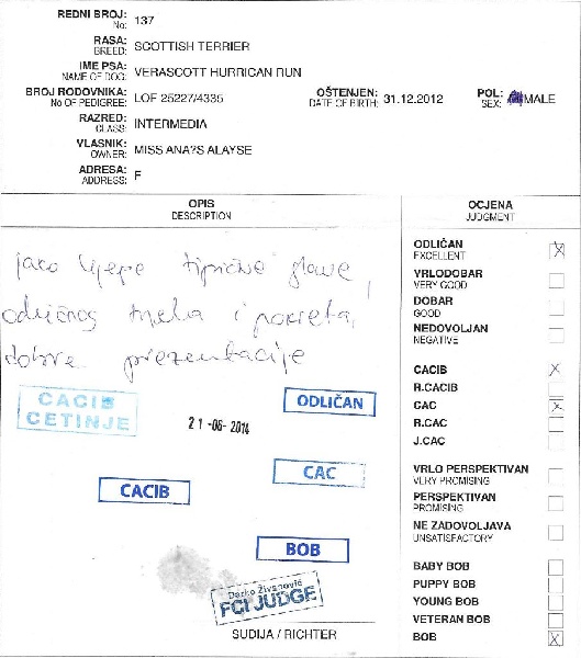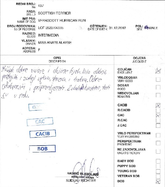 - 1er Exc Cl Ch, CAC SLO, CACIB, BOB, BOG, RBIS