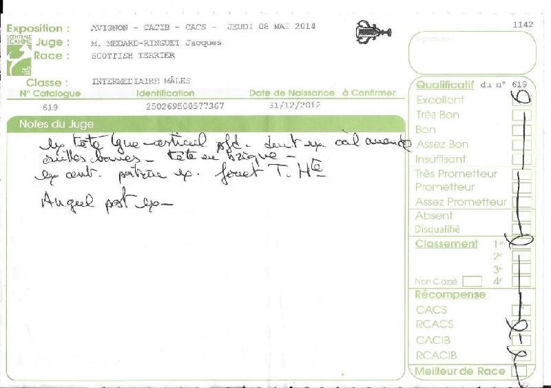 CACS , Du PUY EN VELAY VERASCOTT HURRICAN RUN Classe PUPPY , Juge : Mr ESCOFFIER - A ce jour : TB occlusion , TB proportion en tête ,oeil foncer de bonne forme bonne encolure , ligne du dessus et attache de fouet tres bonne Correct de l'avant et arriere main , mouvement correct Qualificatif : TRES PROMETTEUR ?