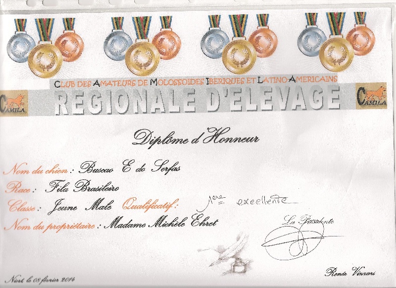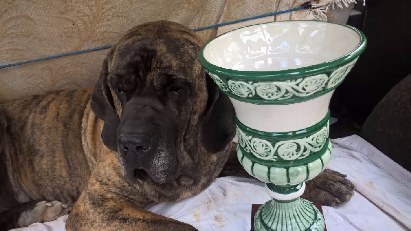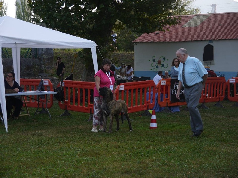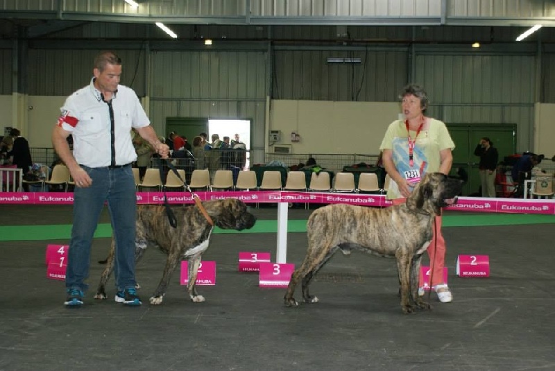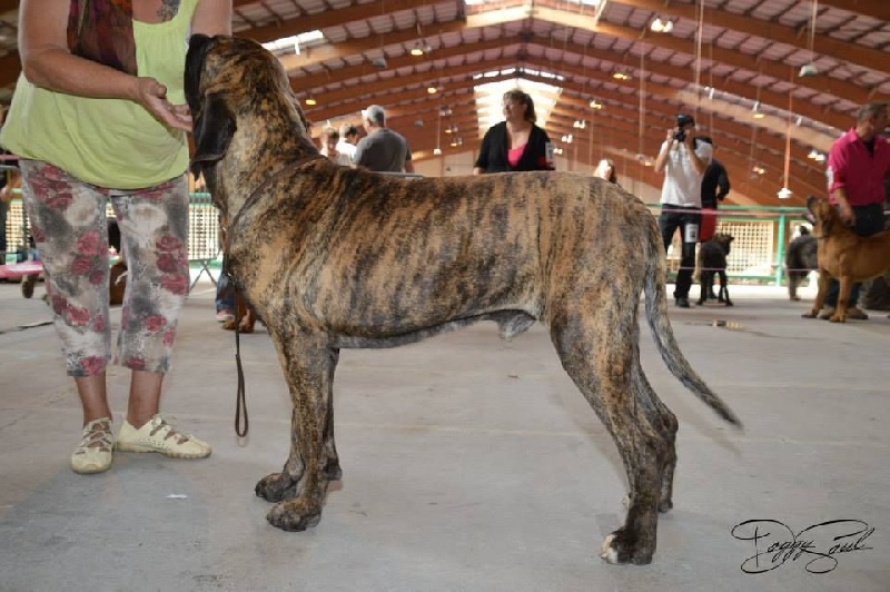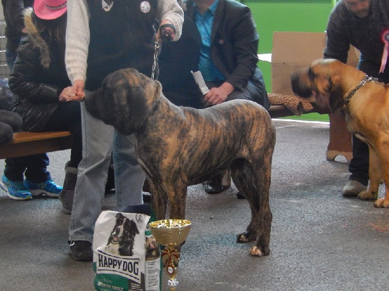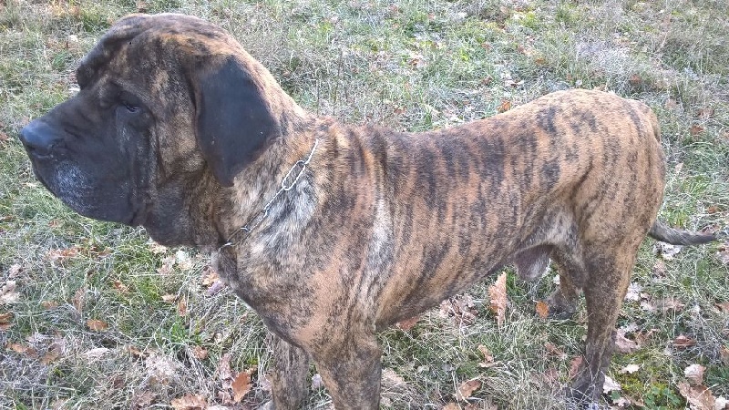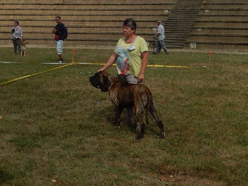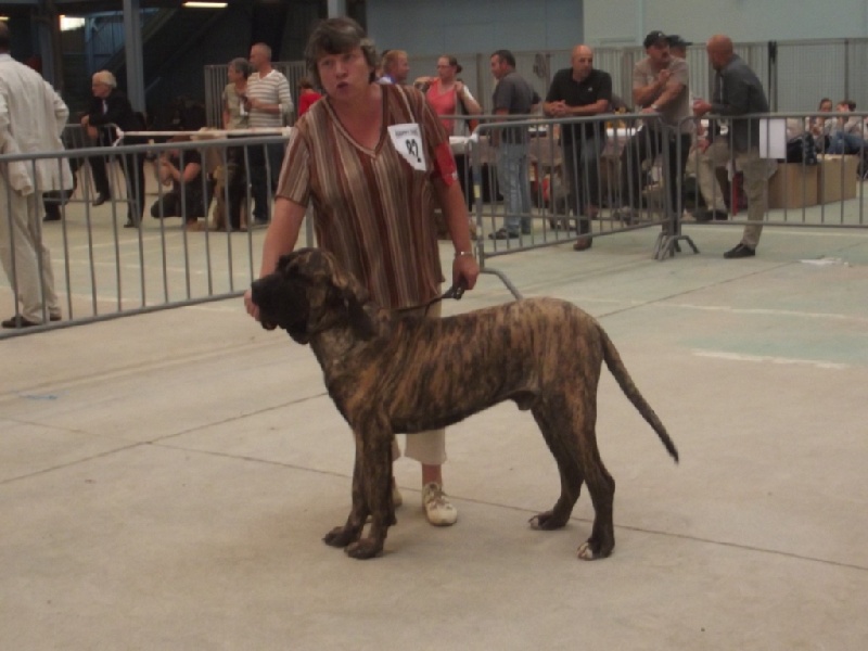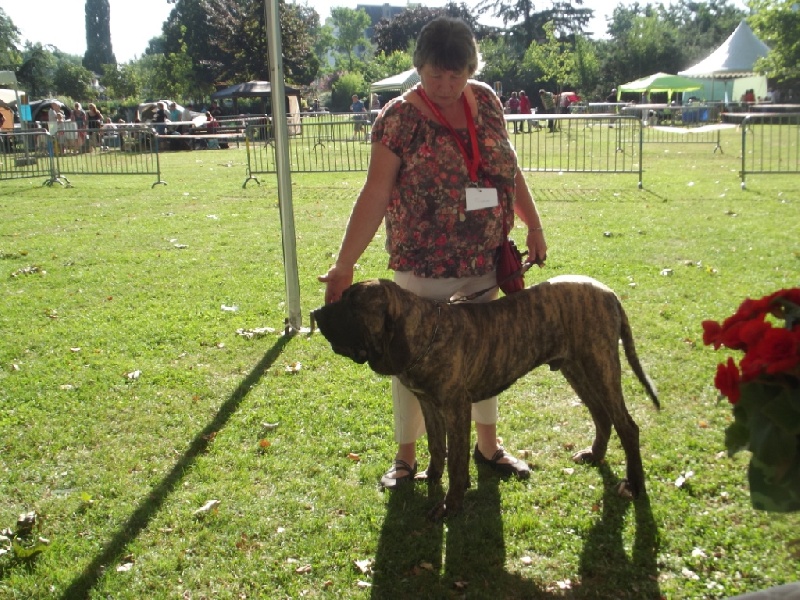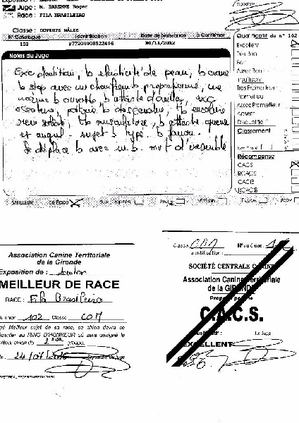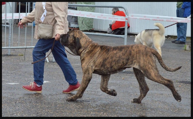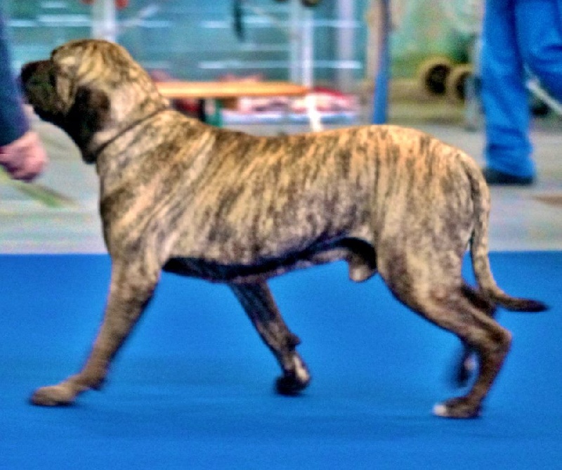 Puissant modèle bringé, bien masqué, excellente pigmentation. poitrine haute, excellent dessus, TB épaule.très bonne ossature, angulation correcte, encolure puissante.Peau lâche, jolie tête, excellente oreilles, denture en ordre.marche l'amble, aux allures : tête plus horizontale.caractère ok