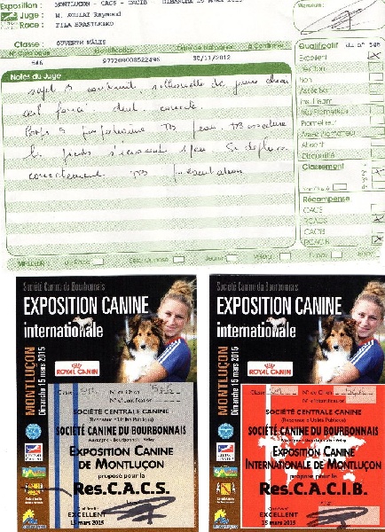 14 mois, Bonne taille, bien typé, très représentatif de la race, un peu long, la tête est de bon volume, museau un peu court, très belle ossature, très jolie robe,excellent dessus : dessous.Belle expression écrase un peu les pieds A/Rbon parallélisme - le pas typiquetrès jolis mouvements de profil puissantexcellent caractère.