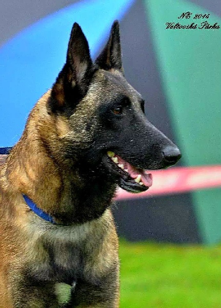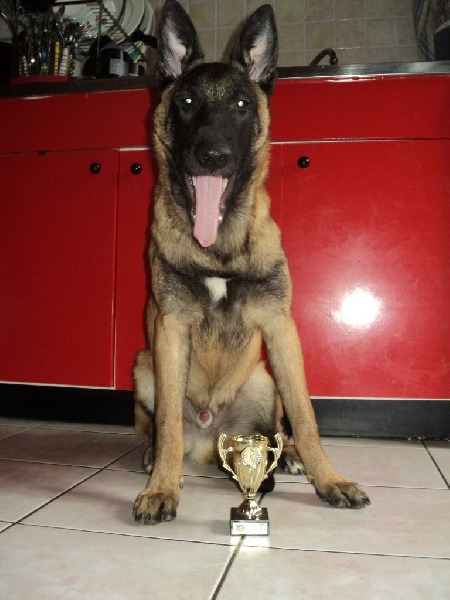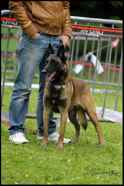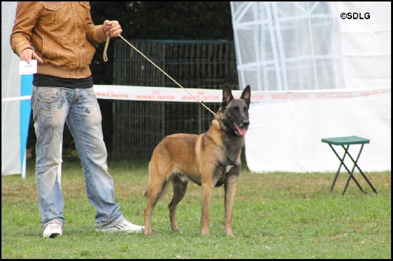 3ans, DCC, mâle de taille moy, encolure B inclinée, B garrot, B dos, croupe un peu fuyante, B poitrine dans ses 3 dimensions, ligne de dessu un peu chargée, exc angu avt et arr, B pieds, B poitrail, B oss, fourrure fauve chaud B charb, exc crâne, stop et chanfrein, B substance ss la truffe, menton correct, exc yeux sombres en amande, oreilles moy portées lgt écartées, exc masque, exc parallélisme,écarte un peu des postérieurs, tricote un peu des antérieurs, excellentes allures avec bonne poussée av, beau sujet expressif