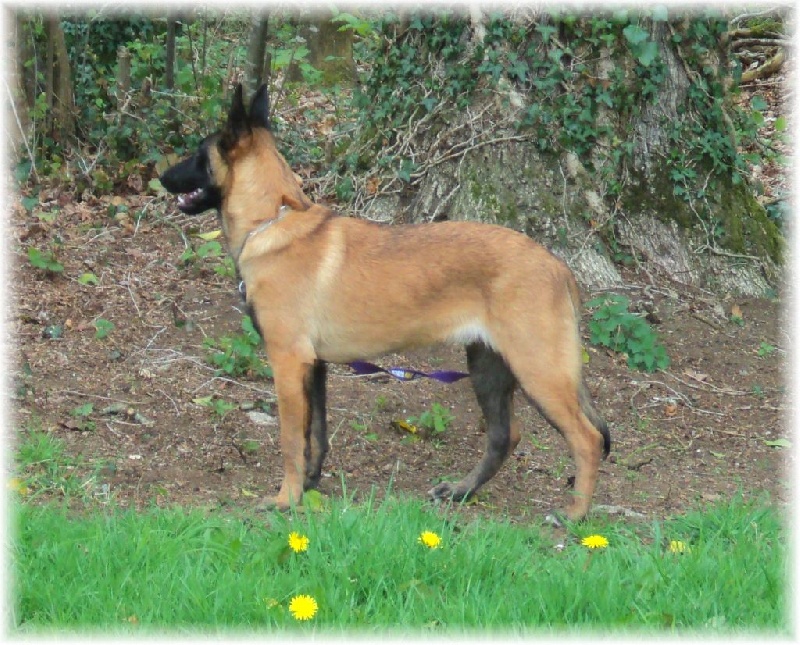 19 mois, DCC, Bonne taille, fauve charbonné, présenté en début de mue, tête médio bien masquée, manque un peu de ciselure ss les yeux, oreilles my, plis marqué, crâne plat, stop correct, B //, B encolure sur un corps médio de B puissance, B croupe, angul arr juste, épaule droite, poitrine correcte, poitrail un peu ouvert, B aplombs, bonne présentation, bon caractère, bonnes allures suff couvrante, fouet B porté