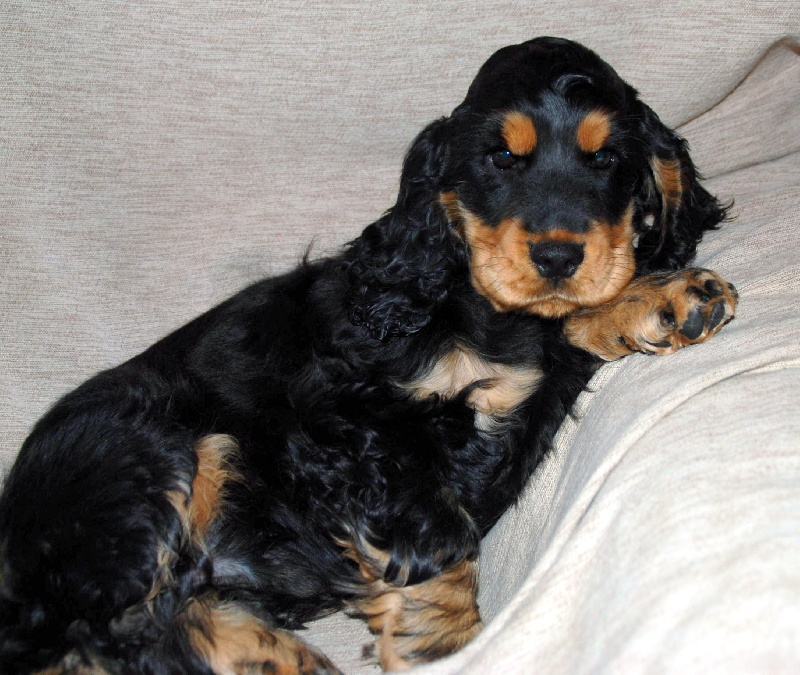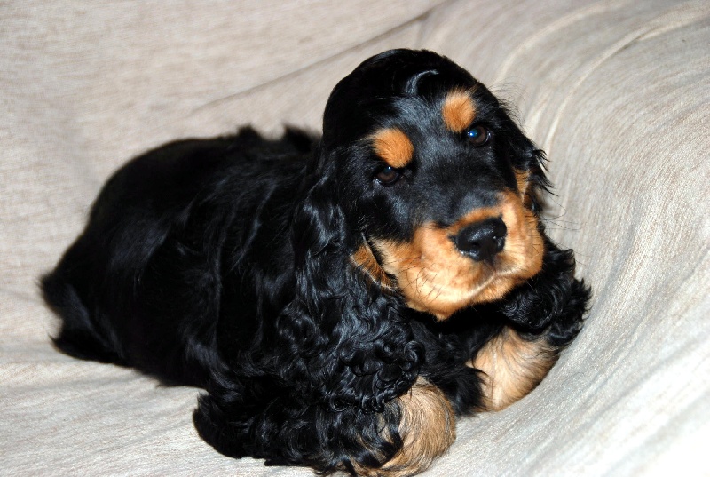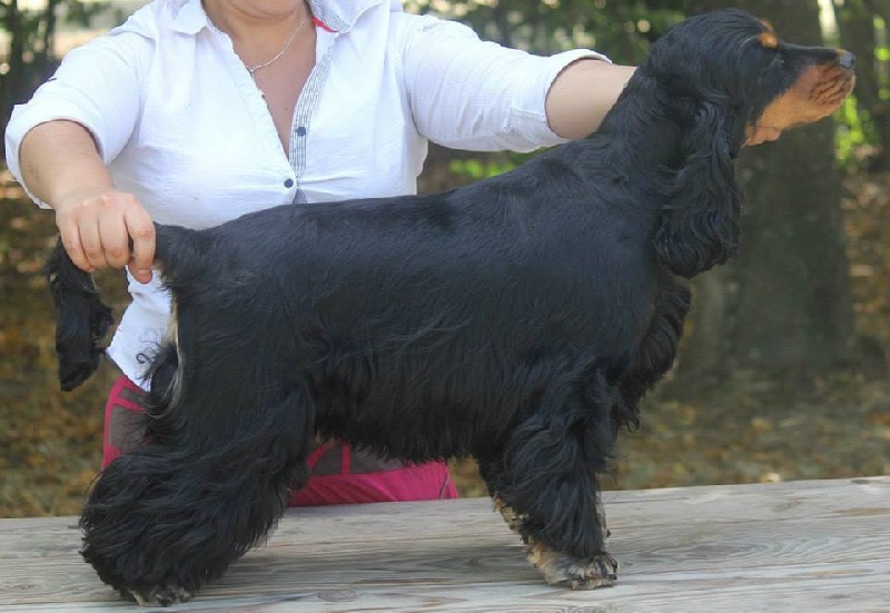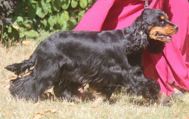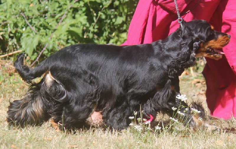 Noir et Feu - Très bien marquée - Jolie tête avec lignes bien parallèles - Excellents épaules, applombs et pieds - Corps court - Bonne poitrine - Belle arrière Main - Belle qualité de fourrure - Marche très bien -