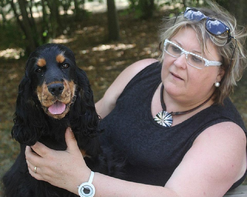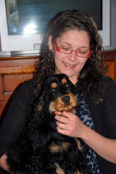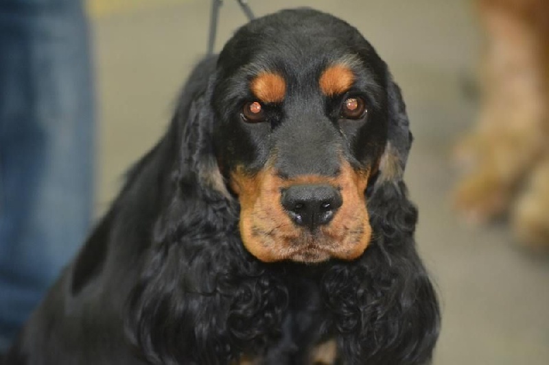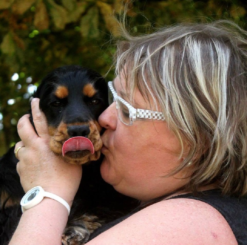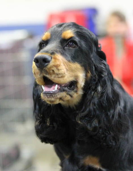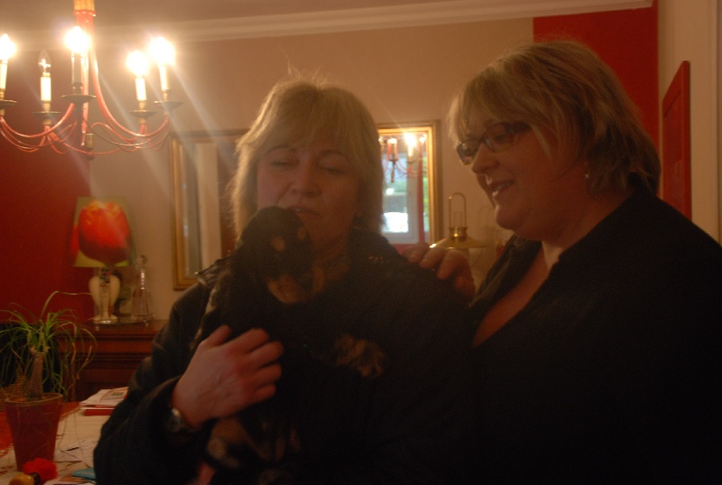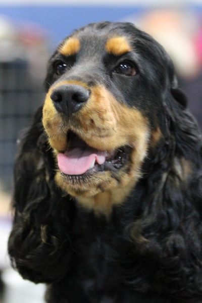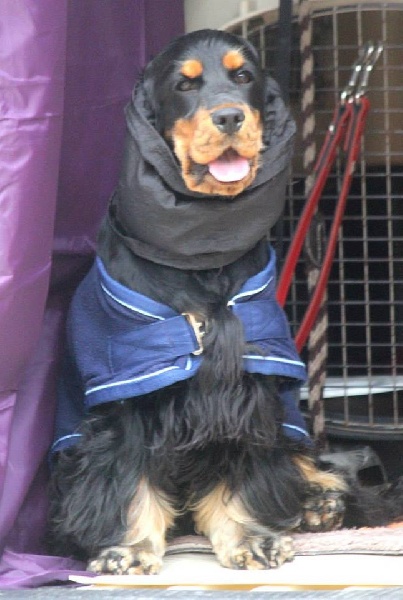 Jeune chienne noir et feu - Tête correctement proportionnée - Oeil bien foncé et bien enserré dans les orbites - Léger manque de lèvres - Attache d'oreilles correcte - Encolure correcte - Léger fanon - Epaules correctes - Bon devant - Dessus solide - Bonne arrière main - Bonne attache de fouet non écourté - Excellente qualité et densité de poils - Démarche correcte -