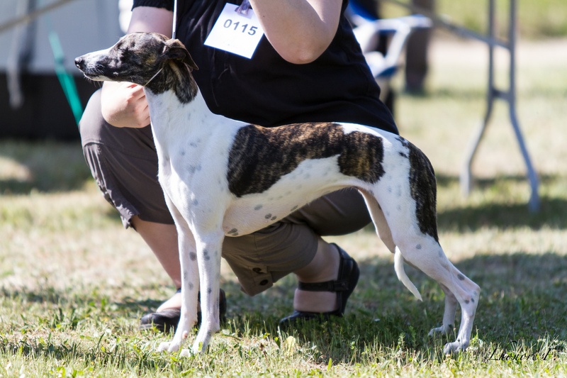 Joli sujet bien dans le type, agréable à l'oeil. Exc tête pigmentation et oreilles, DCC, Exc encolure, Exc dessus. TB descente de poitrine mais manque de profondeur. Exc avant. Interars juste. Exc Arrière. Exc fouet. Exc pieds. Exc mouvement face et profil.