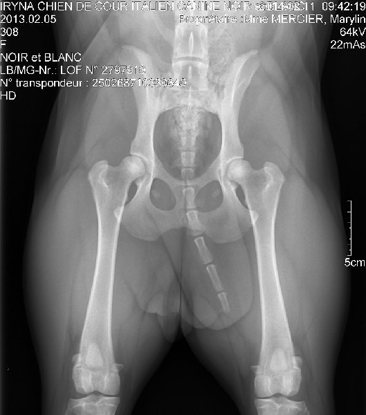 Très féminine. Excellente pigmentation. Oeil un peu clair. Excellente denture. Bonne proportion crâne-chanfrein. Bonne encolure. Bien construite. Très bon format et ossature. Épaule en place. Très bonne ossature. Allures faciles.
