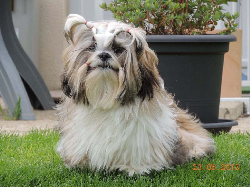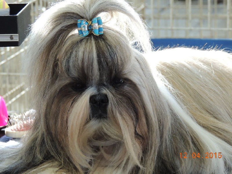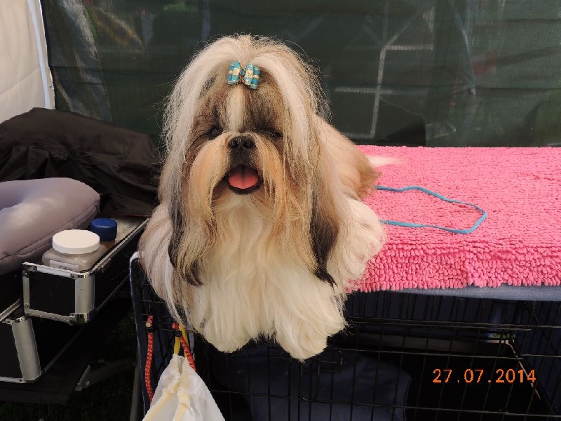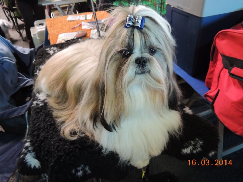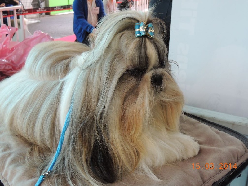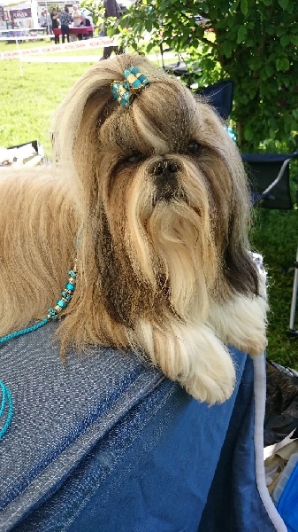 Sujet de grand gabarit, je souhaiterais plus joyeux, bonne forme de crane, bonne longueur de chanfrein, le remouché est correct l'?il de bonne forme et couleur, prognathe, bon mentons, bonne forme de corps, avant main un peu ouverte, angulation suffisantes, poils très bien entretenu et de bonne longueur, ne se présente pas aux allures