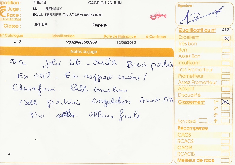 Appréciations du juge :DCC (Dentition Complète en Ciseaux). Jolie tête. Oreilles bien portées. Excellent oeil. Excellent rapport crâne / chanfrein. Belle encolure. Belles poitrine et angulations avant et arrières. Excellentes allures faciles.