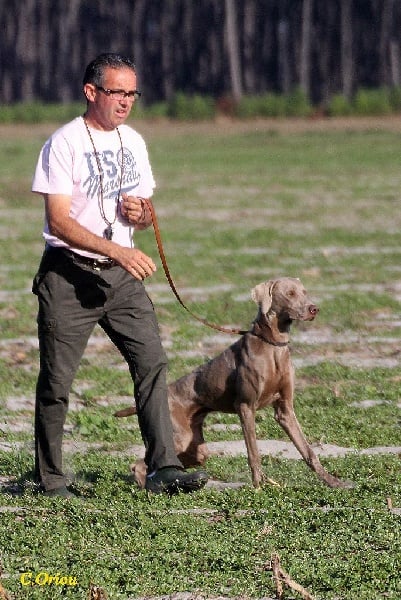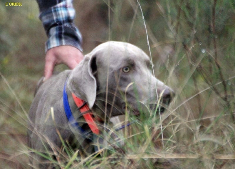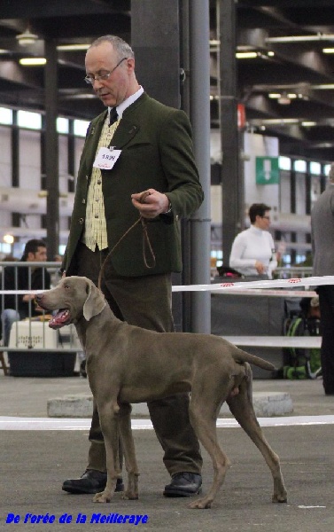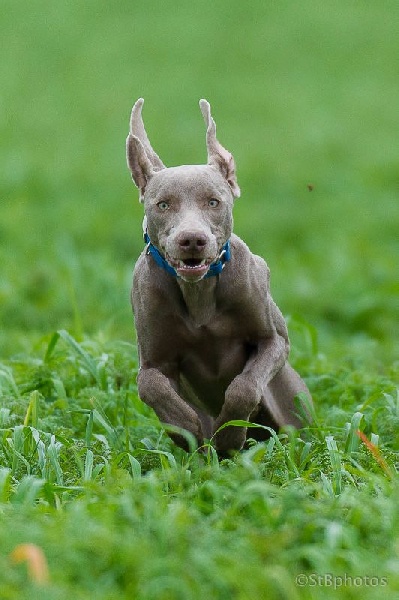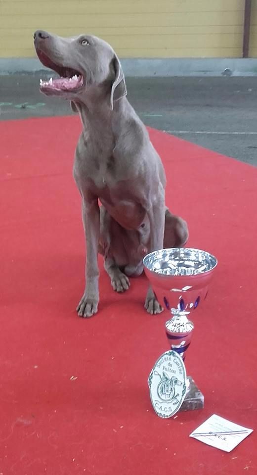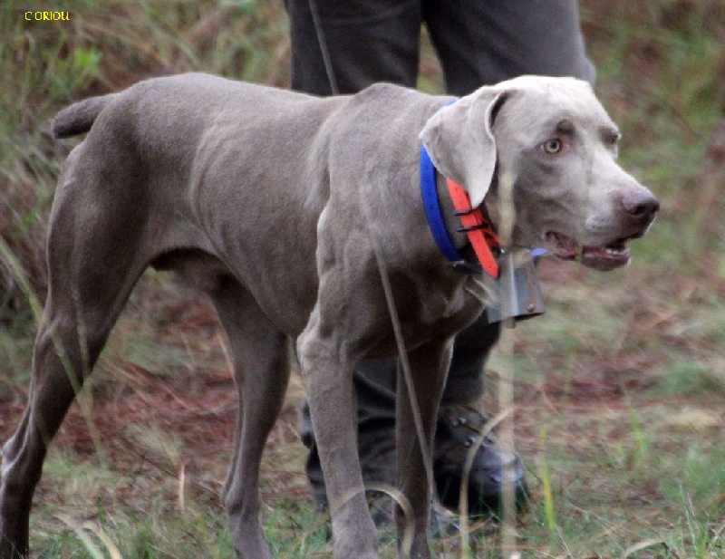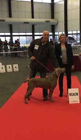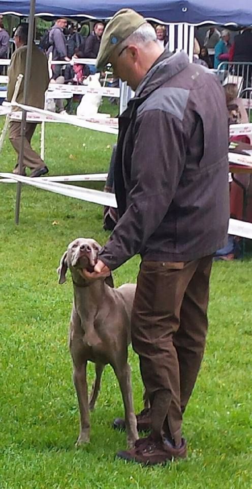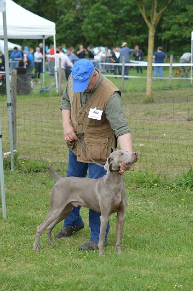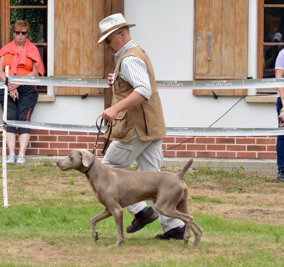 66cm - 3 ans et 2 mois - CDCLa tête mériterait une expression weimar plus affirmée (attache et longueur d'oreille). Manque un peu de babine. L'oeil est correctement coloré. Sortie d'encolure correcte. La construction d'ensemble révèle un modèle sportif. La poitrine est bien faite dans ses 3 dimensions mais pourrait gagner en largeur. Bonnes angulations épaule et cuisse. Les aplombs sont bien dirigés et pieds bien serrés. Très facile en mouvement.
