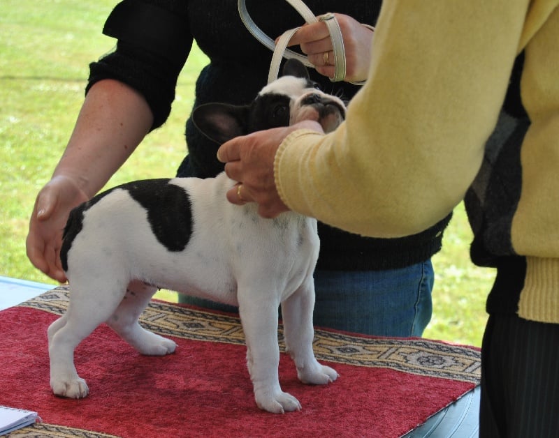 Classe Chiot.3mois, tb tête, stop bien marqué,truffe bien remouchée, trés bonne mâchoire, yeux bonne forme et bonne couleur,oreilles bien implantées et bien portées, excellente nature de poil. Antérieur bien au corps,pieds chat ongles clairs, présence de queue, poitrine déjà bien descendue,bonne démarche.