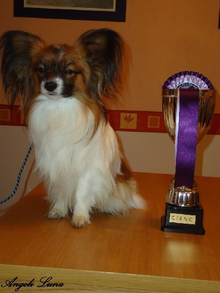 15 mois.Très jolie tête, oreilles bien frangées. Bonne forme de cou, yeux, couleur et pigmentation. DCC. Jabots bien frangé.Bonne épaule et avant main. Excellente arrière main. Bonne attache de queue bien frangée. Jolie culotte.Excellente démarche et présentation