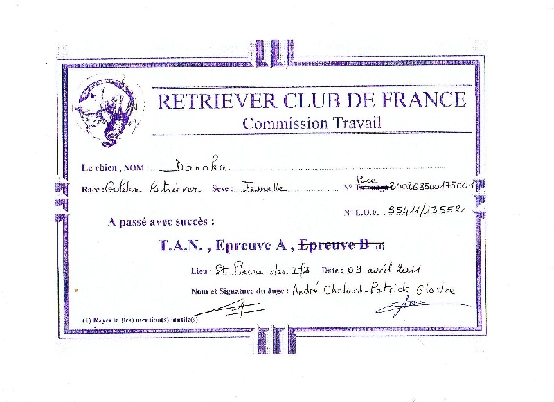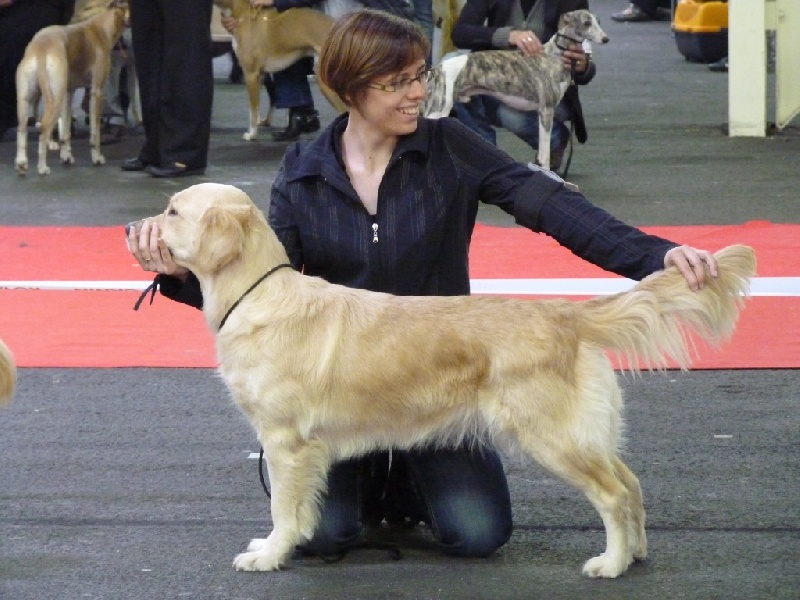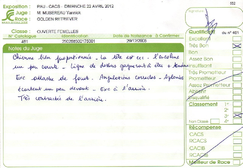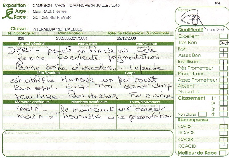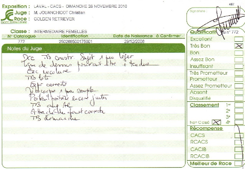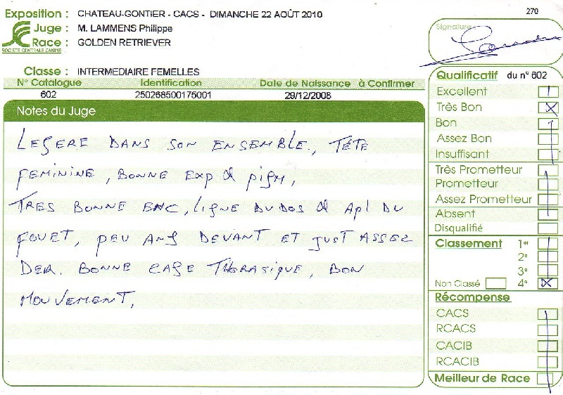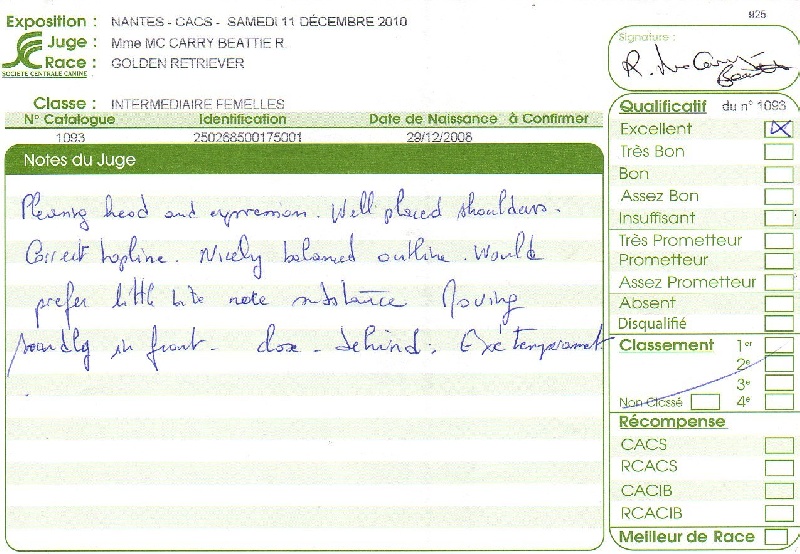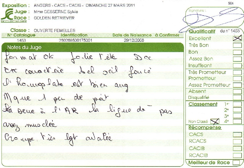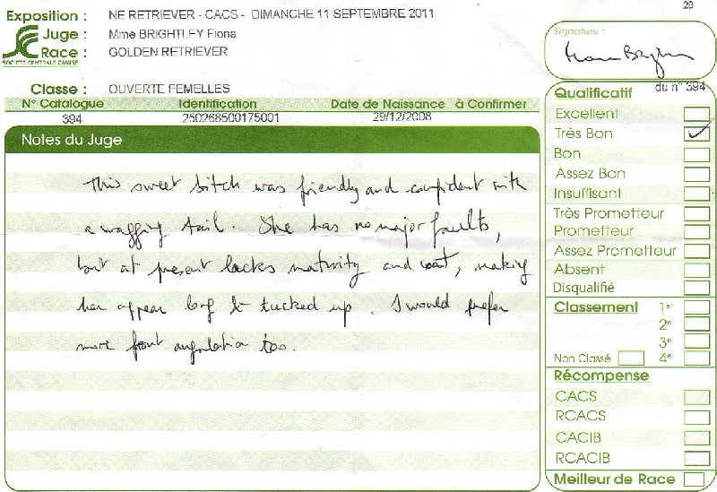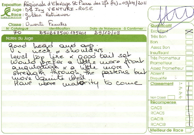 Chienne bien proportionnée - La tête est excellente - l'encolure un peu courte - ligne de dessus gagnerait à être plus tendue - Excellente attache de fouet - Angulations correctes - Aplombs écartent un peu devant - Excellent à l'arrière - Très contractée à l'arrière