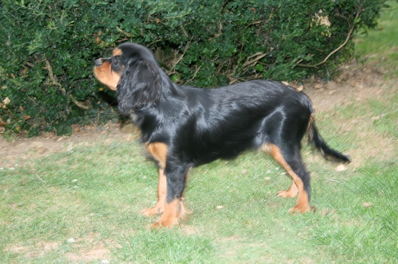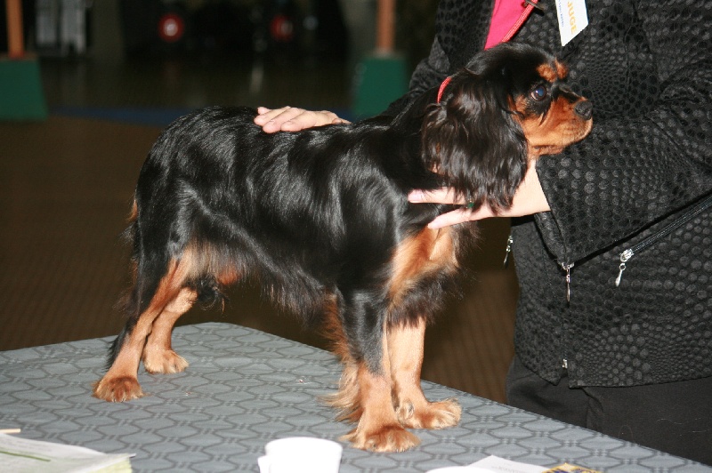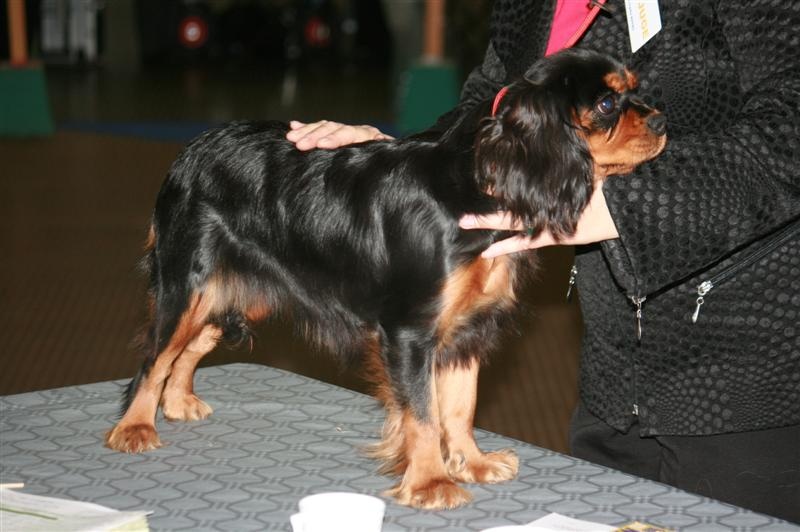 Bonnes couleurs avec feux bien marqués. Encore très enlevée. Ne doit pas grandir. Tête d'un volume correct, stop trop fuyant, oreilles un peu basses et en arrière. Museau doit se remplir, oeil ne doit pas être plus petit. Excellente dentition. Excellente épaule, bon dos, excellente croupe, angulation arrière un peu ouverte, jarrets serres et coudes ouverts à la marche.