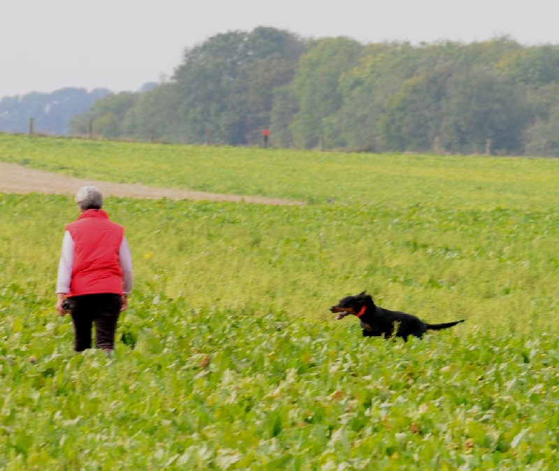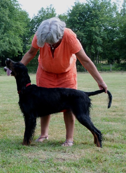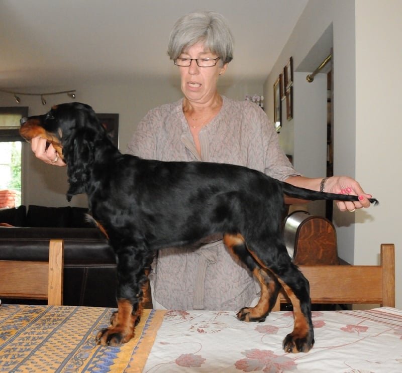 18 mois en mue - excellent sujet bien présenté - dans tous les détails conformité au standard - belle encolure - excellente tête classique - ?il foncé - DCC - excellente démarche - épaules encore un peu laxes.