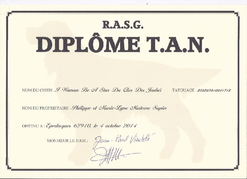 Pas de slip, juste un diplôme.Commentaires très élogieux du juge portugais. A 11 mois eulement Wanna obtient le BOB devant la classe Champion ce qui veut tout dire.