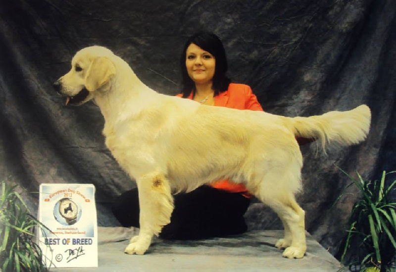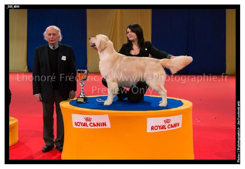 Excellent sujet, parfaitement construit, harmonieux, jolie tête typique, excellent ligne et proportions et expression, excellent sortie d'encolure, excellent angulation aplombs et pieds, excellent dessus, excellent qualité de robe, excellent dans ses allures, bien présenté. (jeune champion de france, sélectionné pour la Cruft 2014)