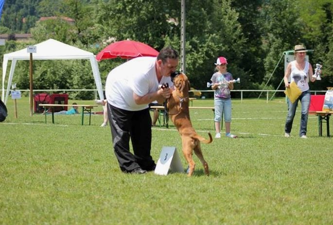 Élégant, plein de substances,attache de l'oreille haute,yeux foncés,stop marqué,joues correctes,babines bien dessinées,aucun défaut de mâchoire, dent 2A, encolure de bonne longueur, taille grand, très bonne ossature, do droit et fort, croupe correct, ligne du dessous bien dessinée, coudes bien attachés, pieds de chats, jarrets corrects,angulation AV et AR bonne et excellente.