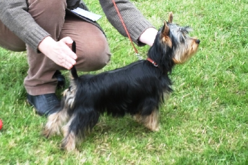 "très jolie chienne, très féminine avec une jolie tête et joli dos; exc oreille, œil, et denture, exc aplombs et angulations. Marche bien. meilleur baby."