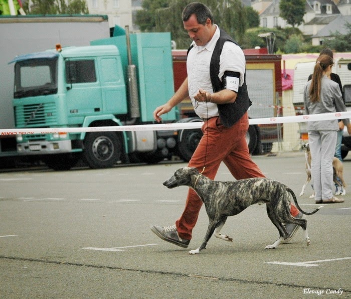 Joli sujetbonne tête masculineExc oreilles, encolure, ligne de dessusExc cuisses, jarretsAngulation avant correctepoitrine correctese traverse un peu à la démarchemouvement correct