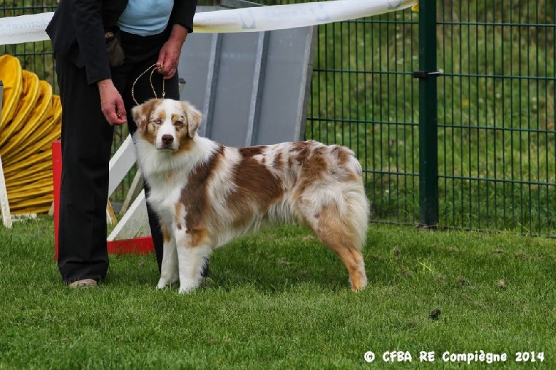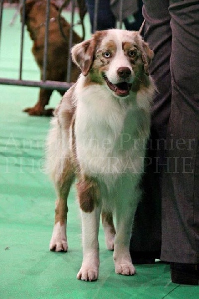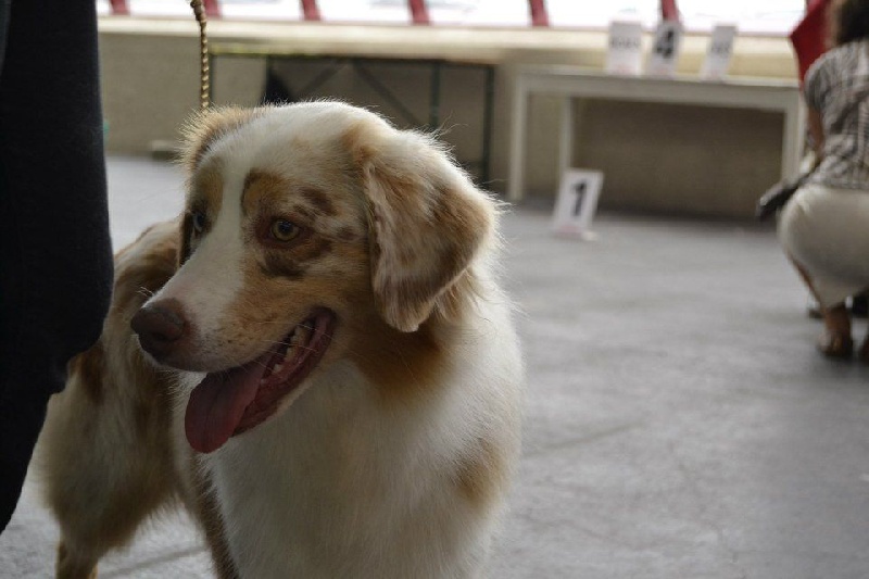 Excellente dentition, oreilles bien attachées, bonne encolure, bon stop, ? bien ? , bonne ossature. Poitrine de bonne forme. Chienne pas très à l'aise en ring, caractère à travailler.Pourrait être plus // des antérieurs.