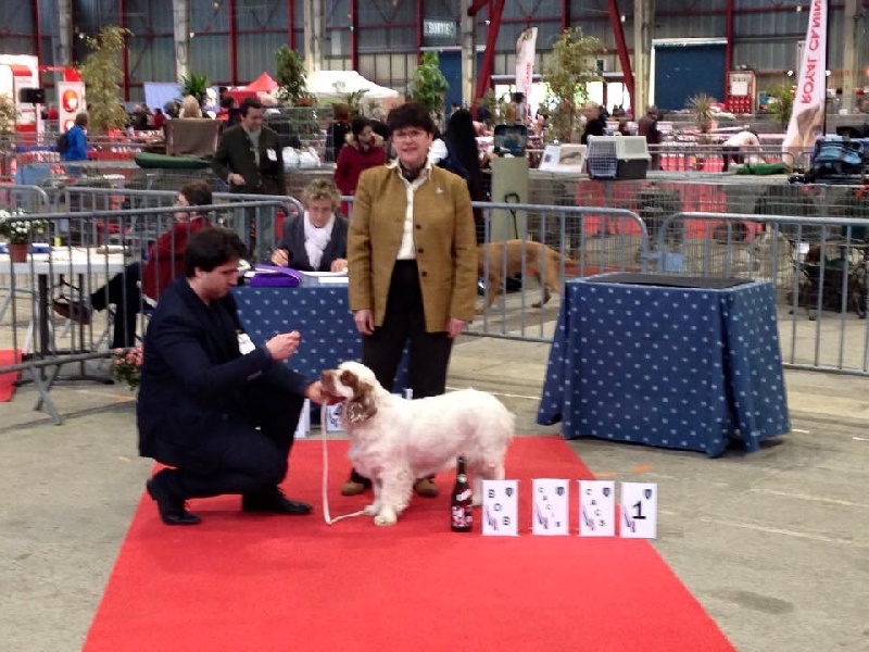 Très jolie tête - excellente pigmentation - ?il noisette - DCC - très bonne encolure - exc épaule aplombs et pieds - ossature molossoide - exc poitrine 3 D - dessus solide - reins puissants - exc attache fouet - marche avec 1 bon mouvement- tres clumber