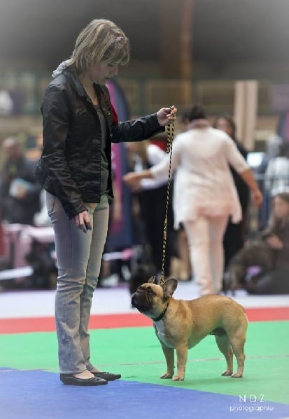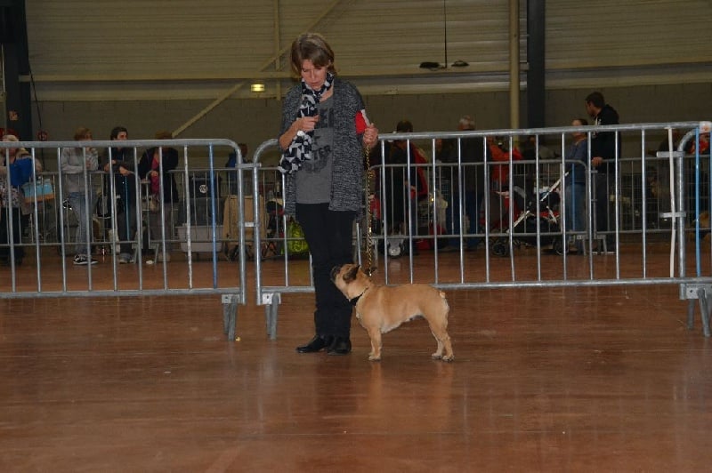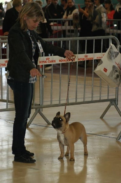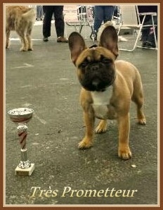 10,9 Kg, Exc crâne, Exc tête, Exc oreilles, Exc stop, Profil correct, mâchoire inférieure large avec prognathisme correct, poitrail correct, antérieurs corrects, Exc côte et poitrine, dos solide, présence léger roach back, Exc arrière main, Exc robe, queue courte, mouvements corrects, allures vives