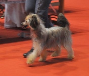 Jolie tête - exc proportions de tête - jolie forme et couleur d'yeux - exc pigmentation - exc épaule, AV main, poitrine, AR main, attache de queue - oreilles pendantes - bonne démarche et présentation