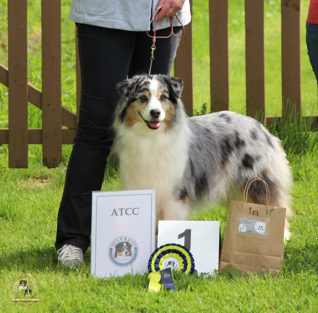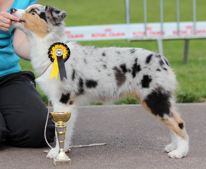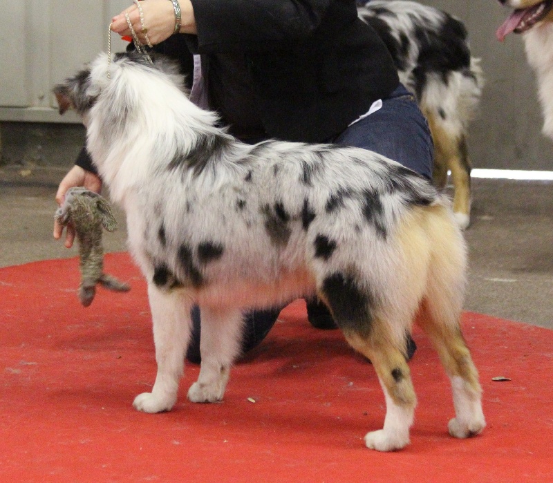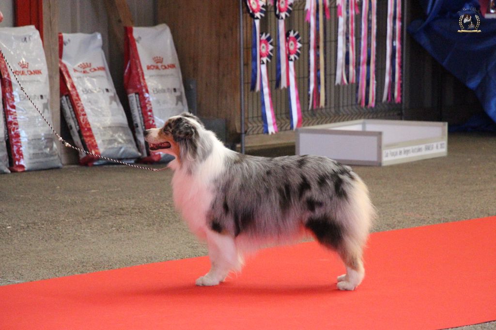 11 mois. DCCJolie chienne bleue en mue ? Sympathique, féminine et attentive. Belle encolure, ligne de dos parfaite et belle descente de croupe.Bien présentée.Os bien proportionnéDoit prendre de la substance.Aller retour correct. Allures puissantes, bergères, souples. Belle poussée arrière.- Meilleur jeune- Meilleur de race