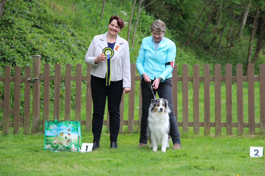 Sujet féminin dans son ensemble - excellente tête dans ses lignes et proportions - excellente pigmentation truffe et lèvres - Exc oeil - exc. oreilles bien placées de bonne taille - exc. encolure - excellentes ligne de dos, ossature, angulations avant/arrière - exc. mouvement régulier de bonne amplitude et exc. poussée - Exc condition générale, caractère et présentation