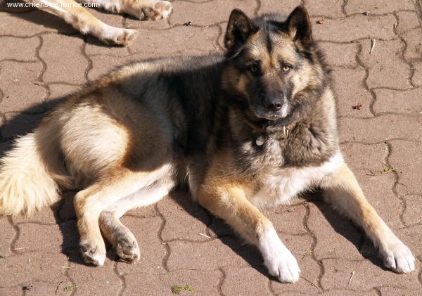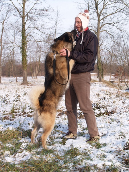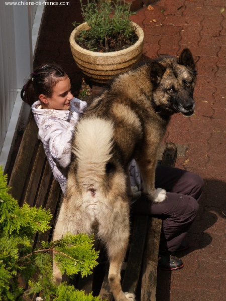 exc construction d'ensemble. Exc tête masculine et expressive. Oeil correct. exc pigmentation. exc implantation et port d'oreilles. Manque P2. bon articulé. exc poids et taille. Bonne encolure puissante. Bonne ligne du dessus. Poitrine correcte. Exc épaule et aplombs ant. Tb angulations AR. exc poil/couleur. Démarche correcte, manque un peu d'amplitude. exc attache et port de fouet.