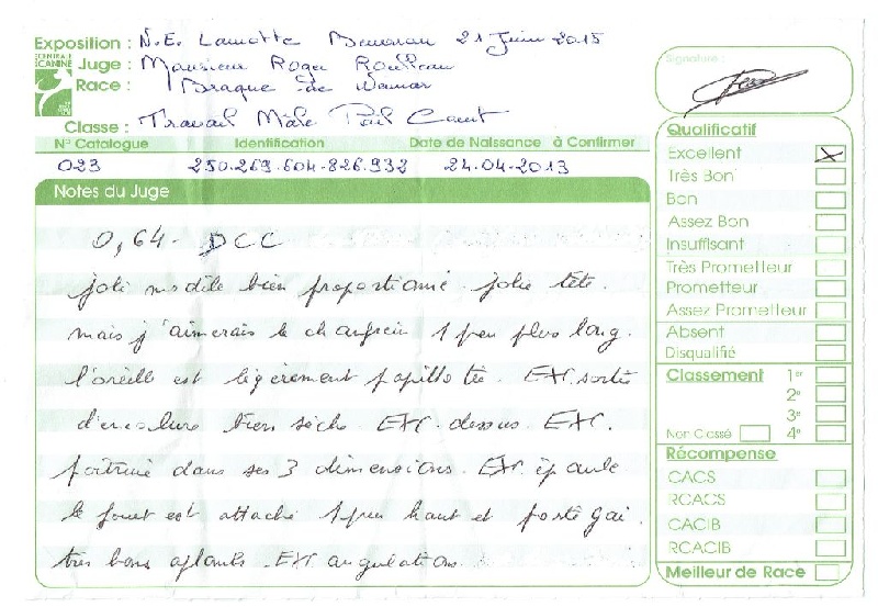 - Classe travail : 1er EXCELLENT, Meilleur de race, Meilleur Mâle.