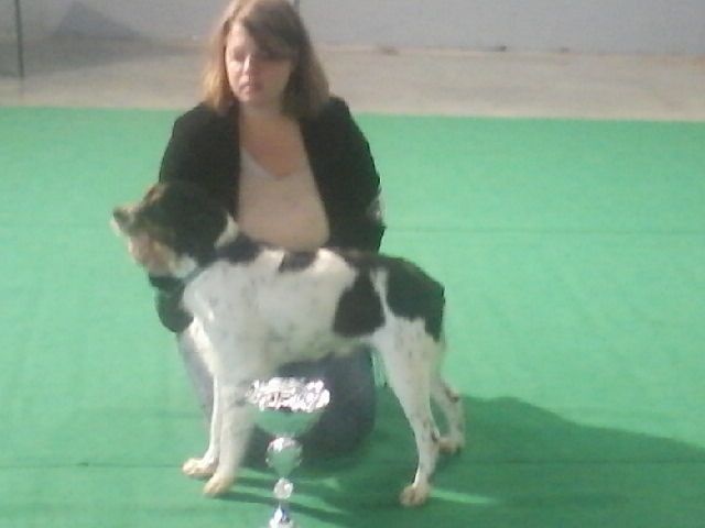 Joli modele, harmonieux, construit sur une exc ossature. Les proportions d'ensemble sont bonnes. Le dessus se tient bien. Le poitrine est descendue. Exs aplombs et mains. TB angulations. La tete est dans le type. Les proportions sont bonnes.Oeil et oreille conferent une bonne expression bretonne. Vif dans l'action. Tricolore conforme.