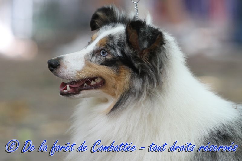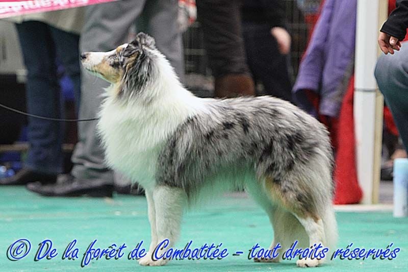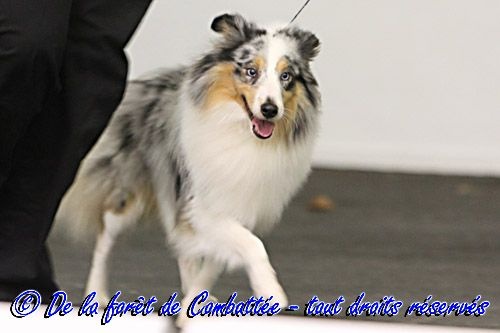 Bleu Ex texture et poil et couleurTB ossatureAplomb conforme. B dos.B encolure Belle expression mais oreilles un peu lourdes.DCC.chanfrein bien plein. Crane plat. Stop netB rapport crane/chanfrein.En mouvement jette devant et manque d'ampleurLe fouet se relève