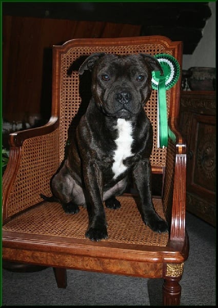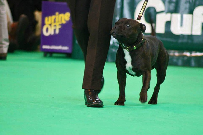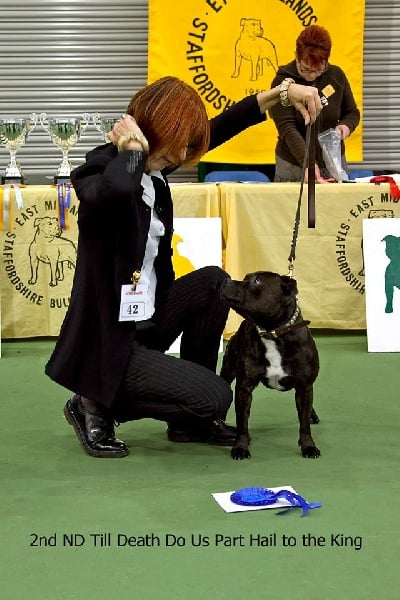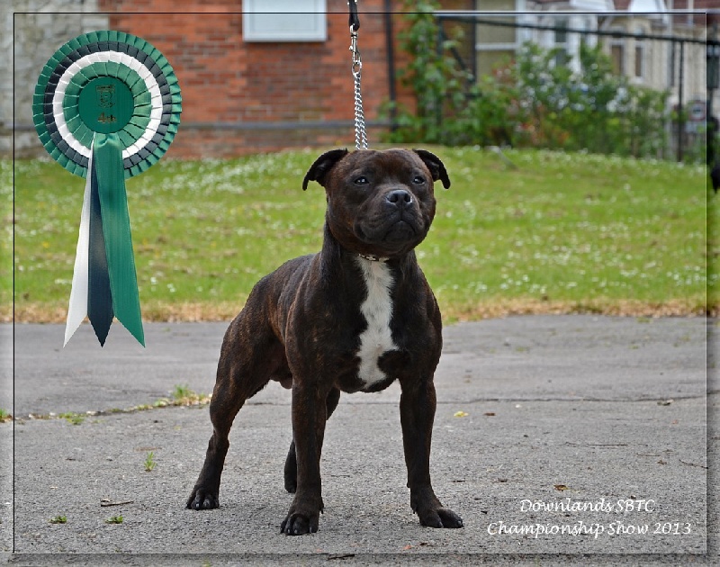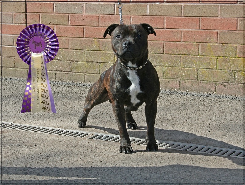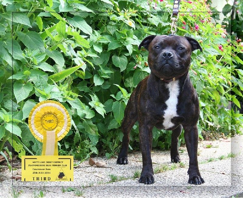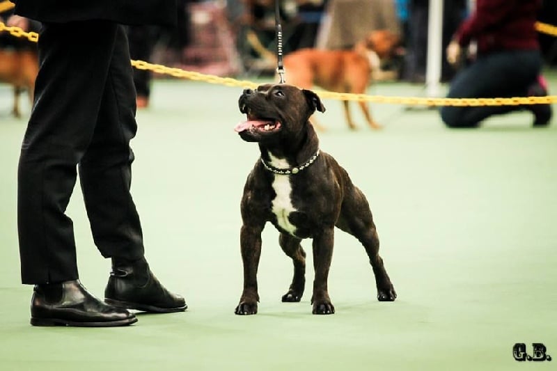 King est un Stafford compact et tonique, très bien construit, possédant un mouvement énergique et doté d'une très belle tête typée sans excès. C'est un vrai plaisir de sortir en expo avec lui car il apprécie l'exercice et il a d'ailleurs été classé plusieurs fois en 2013 et 2014 au Royaume-Uni, se qualifiant pour Crufts 2014. Il participe également aux compétitions de Canicross, et depuis 2016 il est mon binome en CaniVTT, discipline qu'il adore et dans laquelle il a remporté le Chien d'Argent 2016 du Trophée FSLC CaniVTT, comme Chilli et Flora avant lui.