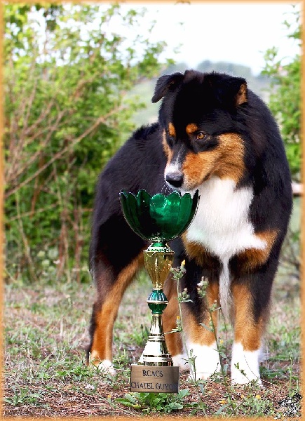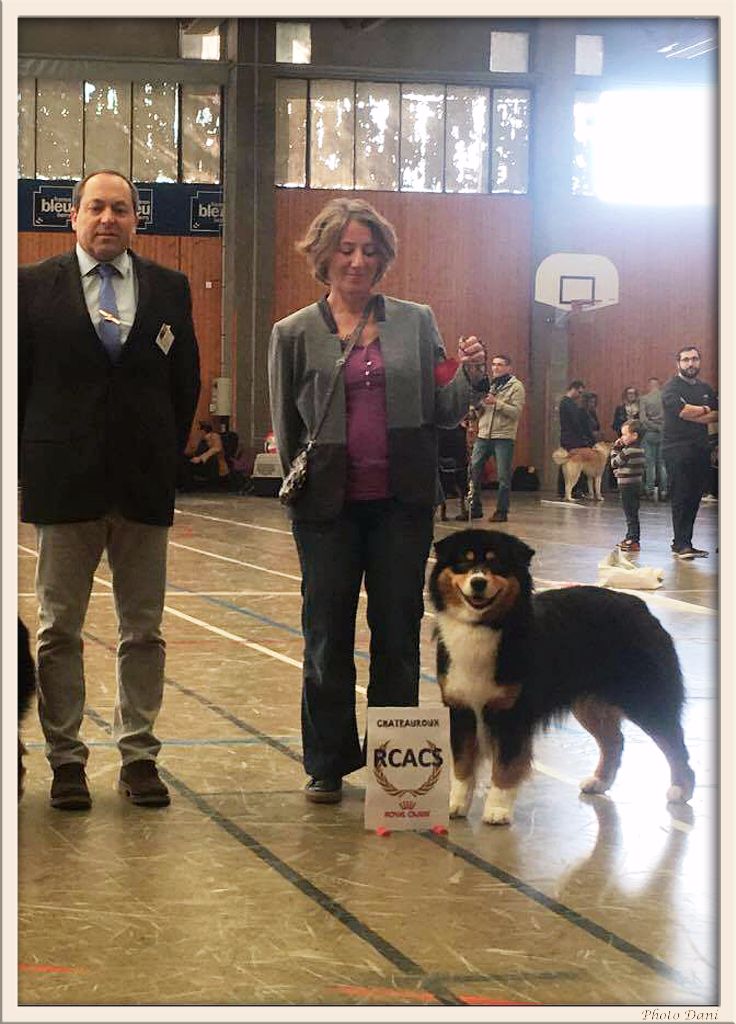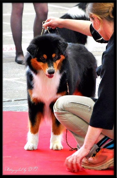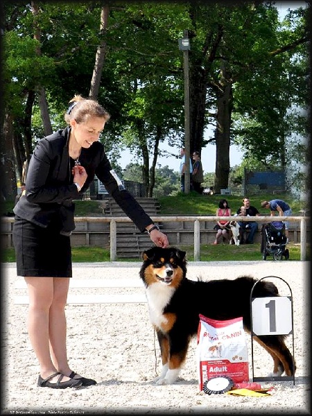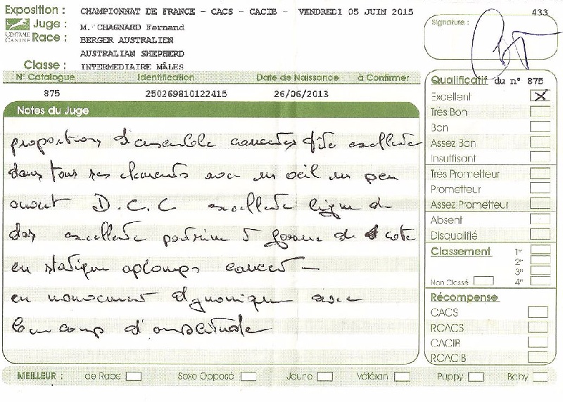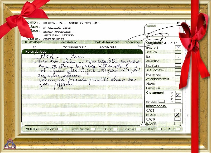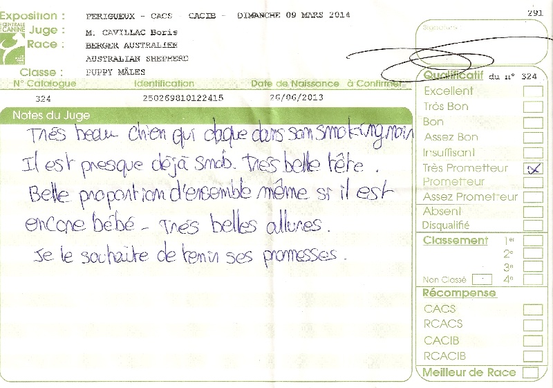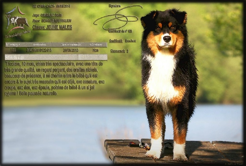 Dans une Classe Intermédiaire de 35 chiens, sous le jugement de 3 juges successifs, il obtient respectivement :- Mr Jan De Gids (Pays Bas) => "Très Bon" pour cause d'allures soit disant irrégulières- Mr Philippe Lalanne de Jonquel (France) => "Excellent"- Mr Jean-Claude Larive (France) => "Excellent"Il finit donc "Excellent" non sélectionné, bravoo mon petit nours.Le Club de Race du Berger Australien lui remet ce jour là le Titre de Champion Jeune Club de Conformité au Standard pour l'année 2014 !!