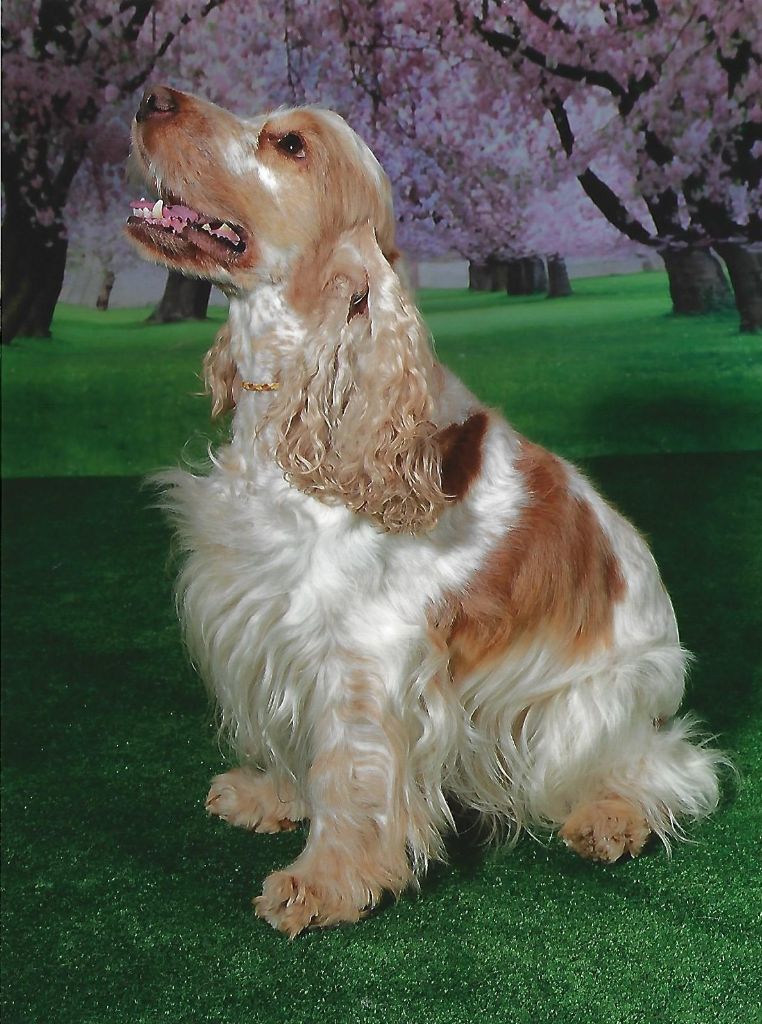 Jolie chienne présentant un bel ensemble. Bien cocker. Blanc et orange avec une belle pigmentation. Jolie tête. Excellente épaule. Jolies pieds. Bonne poitrine. Jolie fourrure pour une blanche et orange. Marche correcte.
